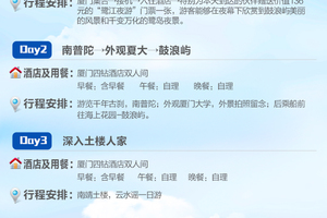 如时间充裕,可自行前往全国唯一一条彩色【环岛公路】,黄色海岸线-环岛景区,为电影《疯狂赛车》拍摄地之一;最后游览号称“全国最文艺的村子”闽南原生态小渔村【曾厝垵】这里到处都充满着“小清新”的艺术气息 。适时自行离开,前往机场/车站