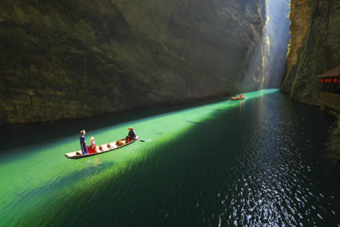 屏山地形奇特,整体呈狭长弧形地势,四周峭壁耸立,碧水穿梭其中,清澈见底,船行河面恰逢一束阳光从峡谷上方洒下,在河面形成暗色投影,船只犹如悬浮在半空中。逢此天工美景,你脑补的我们都想到了,特为你准备了,当地民族服饰,古装以及纸伞,端坐在木船之上倾国倾城不倾船。作为一个真正的戏精,请时刻保持镜头感,来给个V,我保证看不出来是摆拍