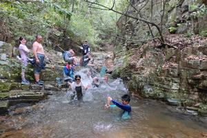 餐后乘车前往百木潭,约1小时抵达梯子坑,轻装出发去玩水啦。这片溪水非常清澈,大家一路嬉戏玩水。各种玩水神器拿出来,泼水、打水仗。沿着溪水一直行走到传说中的百木潭,探秘当年济公施展大法力的地方,跳潭戏水,乐趣无穷。