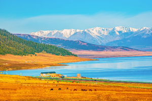 早餐后,我们走独库中段前往赛里木湖(车程约6小时小时),十月的赛里木湖畔,告别花草如海的夏,迎来了金色苍茫的秋,山深邃的湖水使人感到生命的奔腾,苍劲的秋风送着袭人的凉意,这番苍凉幽缈的秋景,是一种难得的美。一望无际的金色草原装扮着赛里木湖的秋,“勤劳打草、收获新绿”的憧憬,在满目金色中变成了现实。松林与草原相连,远山与湖水相映。淡蓝而深邃的天空,黛青色的山石,碧蓝碧蓝的湖面,满目金黄的草原,层次分明,构织成一幅天水合一的美景。今天我们入住景区内湖边的房车,所以有大把时间可以在这里游玩。