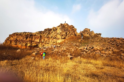 9:00多到达六合,热身后开始徒步,先登顶方山。方山古时有八景,尚存梵天寺、王子石、猫儿石、凤凰泉、燕翅峰五景,加上今人新评定仙人洞、避风石、虎石松、古银杏树、方山火山口五景,是为方山十景,我们的徒步线路会途径其中部分景点,过了仙人洞之后有点小攀爬需手脚并用,大家相互帮助,即可轻松通过。