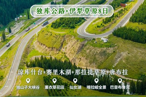 早餐后前往唐布拉百里画廊,可自费骑马(选择正规马队)前往仙女湖。仙女湖清澈、幽静,静卧在雪山的怀抱之中,丝绒般的草原从眼前一直延伸到天边,悠闲的牛羊、洁白的毡房、巍峨的雪山、青葱的云杉,眼前的一切都犹如世外桃源般悠闲自得。接着继续沿独库公路一路北上,这也是独库公路最美的一段,沿途美景让您惊呼,穿行于这条英雄之路,感受一天四季的飞速变换。傍晚抵达酒店入住。