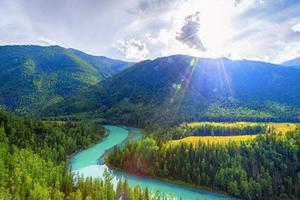 空中草原在那拉提山谷里的一个开阔地带,在半山腰上,雪山脚下就是草原。 每年6月之后,大群的牲畜转入,进入草原的黄金季节,草原人的各种集会多在此举行。自古以来就是著名的牧场。河谷、山峰、深峡、森林交相辉映。