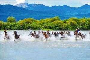 早餐后约8点前往昭苏湿地,这里是伊犁州面积最大、海拔最高的高原湿地,也是中国为数不多的典型高原湿地公园,公园里森林茂密,芦苇丛生,水禽姿态优雅,争奇媲美,百鸟齐鸣,清脆悦耳,飞翔觅食,婀娜多姿。在这里,天蓝得过份,花开得放肆,景美得醉人,徜徉其中,整个身心都会彻底放松下来。新疆伊犁昭苏县享有"中国天马之乡"的美誉。盛夏时节,大批伊犁马到河里饮水洗澡、嬉戏奔腾,被称为"天马浴河"。2022年6月以来,昭苏县在湿地公园每天举行两次“天马浴河”节目表演。每次有40匹“天马”参加表演,牧民从山上赶着马匹一路驰骋而下,走近河岸。赶马人一声吆喝,马会立即在岸边停下来,稍微休整二三分钟,然后赶马人又一声号令,马瞬间跳进河流奋蹄奔腾而起,河面上水花飞溅四射,场面壮观奇美。