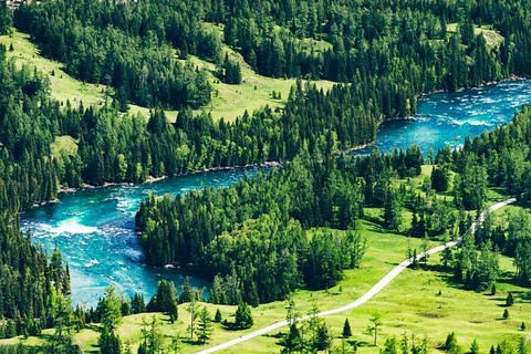 这里的区间车每到一个景点都会停车,每一个景点你都可以下车游玩,玩好了,再上停靠点等后边来的区间车, 从喀纳斯到贾登峪的路上一路经过纯净的鸭泽湖、神仙湾、圣泉、月亮湾、卧龙湾,每个点都有区间车停靠。游览完大约13:00,我们前往贾登峪用餐后赴禾木景区(约3h车程)。