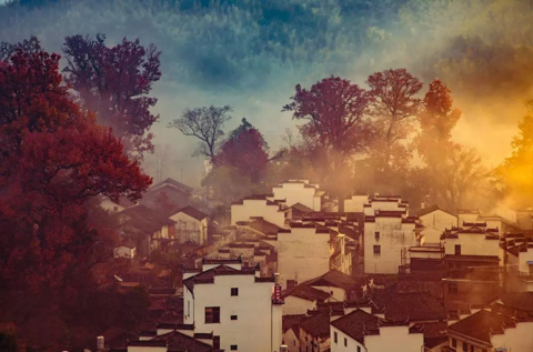 梦幻的秋日清晨,一般晨雾一般炊烟,三两红枫散落村庄,登高远望,层层叠叠