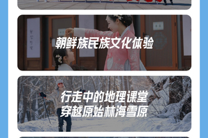 ⑤自然课堂+原始森林徒步+冬捕;农夫山泉工厂研学;朝族族村落研学;梦幻热水河漂流;长白山北景区+环保倒战车+天池主峰越野车;长白山自然博物馆研学;