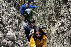 韭菜沟,全长1.5公里,因沟谷的崖壁上长满野生韭菜而得名。大家相互帮助,相互鼓励,老人帮新人,小帅哥帮小姐姐,有惊无险全员安全通过。