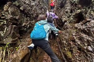 景区在崖壁两边安装了铁链,降低了难度,大家借助铁链往上爬,要是没装这铁链时,爬上去是很难的。