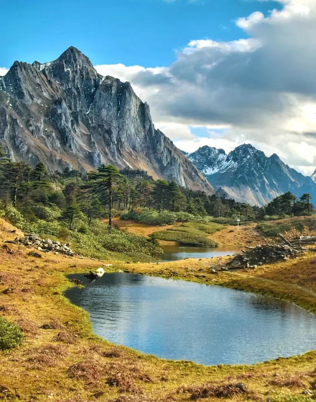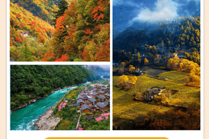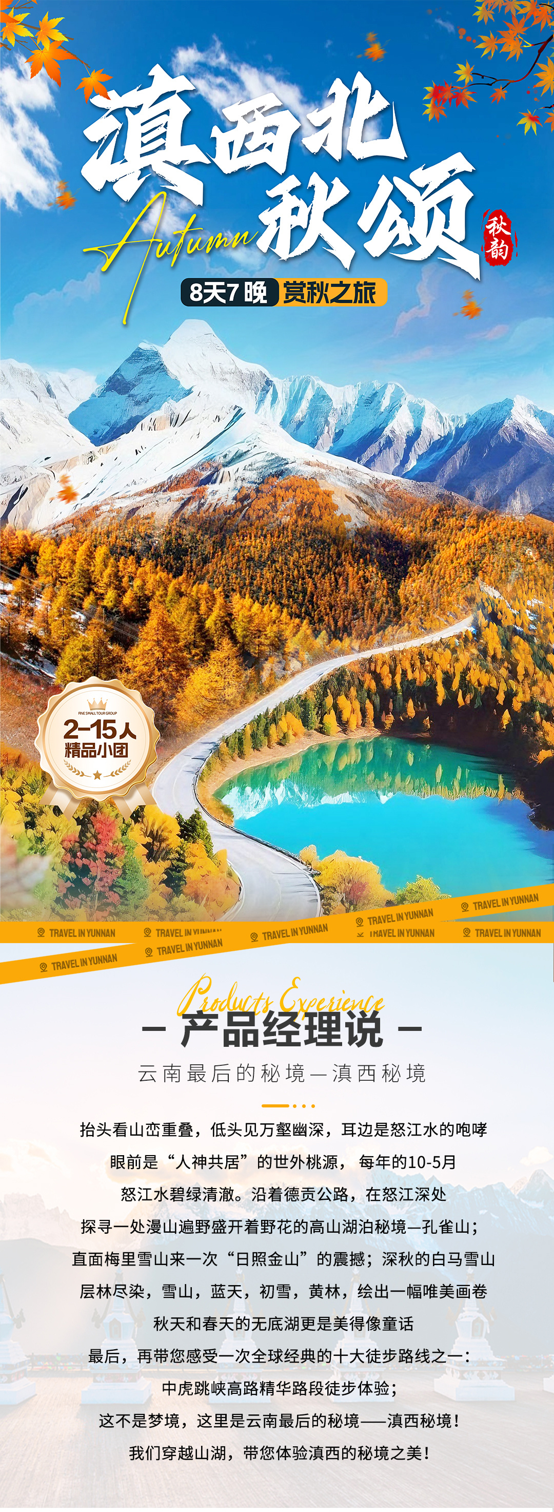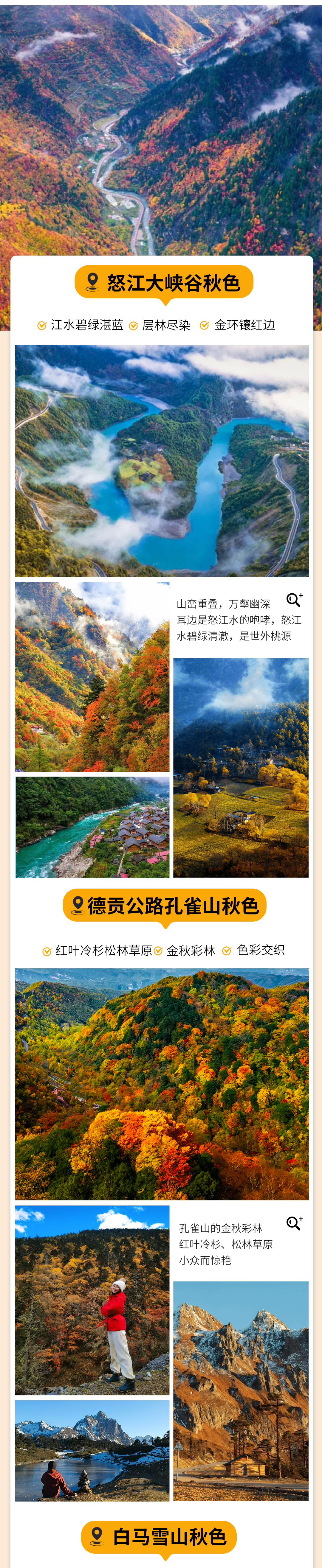 【秋色盛宴】:赏滇西秘境深处醉美四处秋景:怒江大峡谷秋色+德贡公路孔雀山秋色+白马雪山秋色+无底湖秋色,一趟旅程,金色彩林、峡谷秋色、日照金山、圣湖倒影等各种元素全聚集。