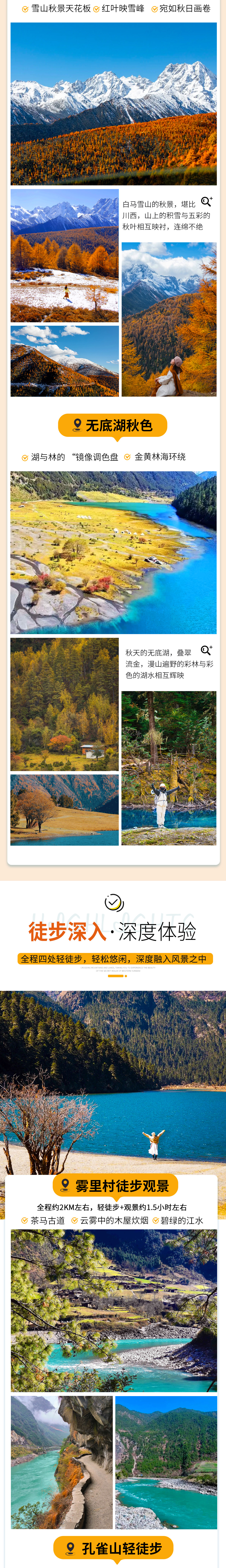 【徒步深入】:雾里村徒步观景+孔雀山轻徒步体验山野之美(往返轻徒4KM左右)+无底湖绕湖3KM轻徒步看醉美秋景和倒影+虎跳峡高路徒步精华段(往返5KM平路式的休闲徒步观景体验);四处经典路段的轻松而休闲的徒步,无难度和强度,带您深入和感受不一样视角下的醉美滇西秋色!
