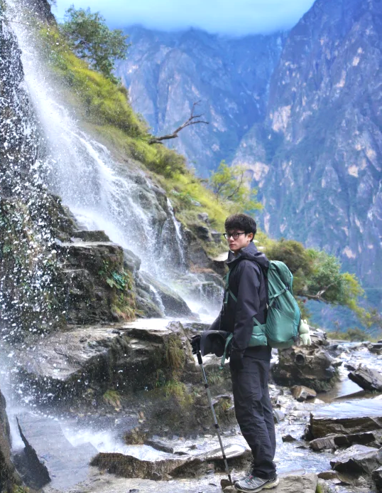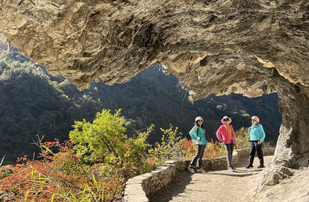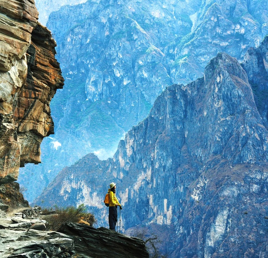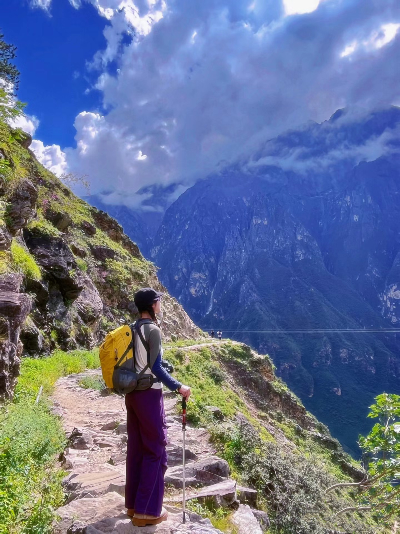 从中途客栈往张老师客栈方向徒步就是精华路段。虎跳峡不愧为《国家地理》推荐的十大经典徒步路线之一。沿着高路行走,极目望去尽是悬崖峭壁、崇山峻岭;穿行在深达3900米的U型峡谷间,两侧绝壁高耸入云,脚下是蜿蜒江水,抬头是一线蓝天,大自然的鬼斧神工让人忍不住感叹人类的渺小!最后到达【龙洞瀑布】,龙洞瀑布从险峻的山峦间倾泻而下,犹如一块洁白的哈达高挂在悬崖绝壁之上,大有疑是银河落九天之气势,拍照打卡结束后原路返回到中途客栈。