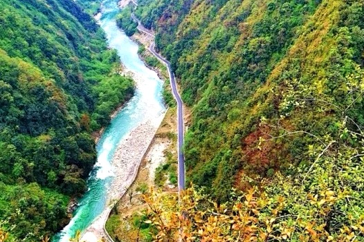 早晨后出发,路上前往打卡另外一处秘境之地-【神田】,这里秋色绝美,蓝天白云加上两边渐染的红黄叶,倒映在峡谷里面的水潭之上,眼睛恍如进入仙境。之后返程路上可以继续欣赏沿途原始森林风光,大概中午便到达贡山,在这里休整一下。