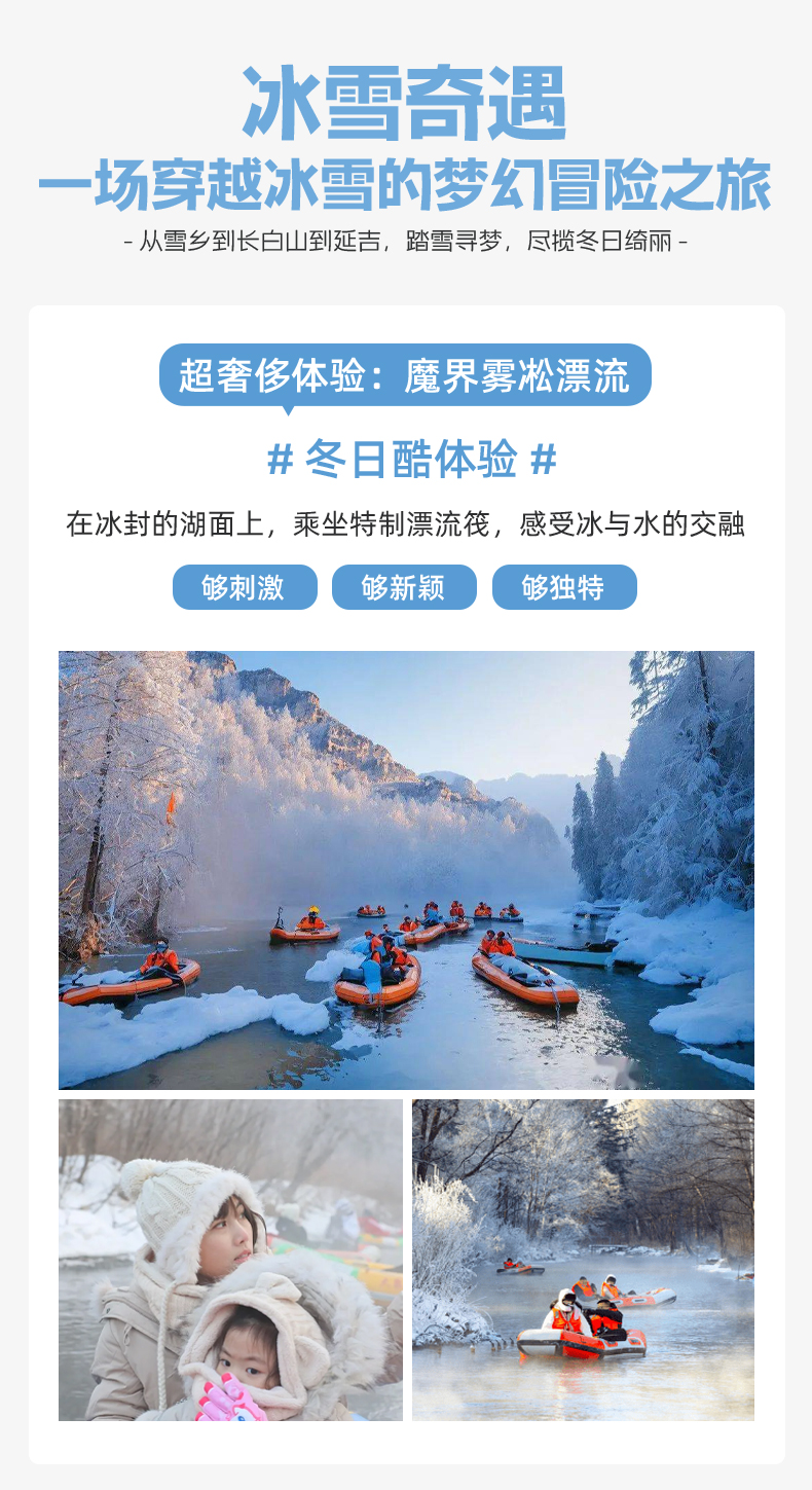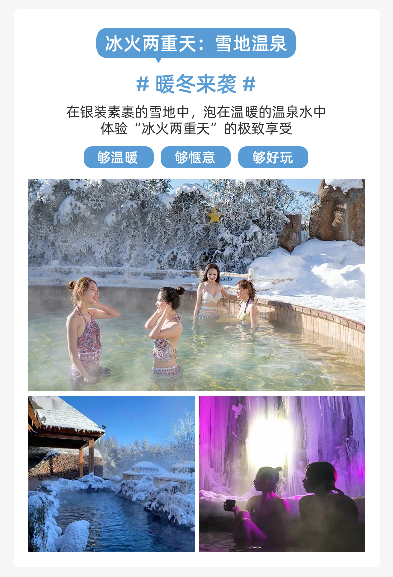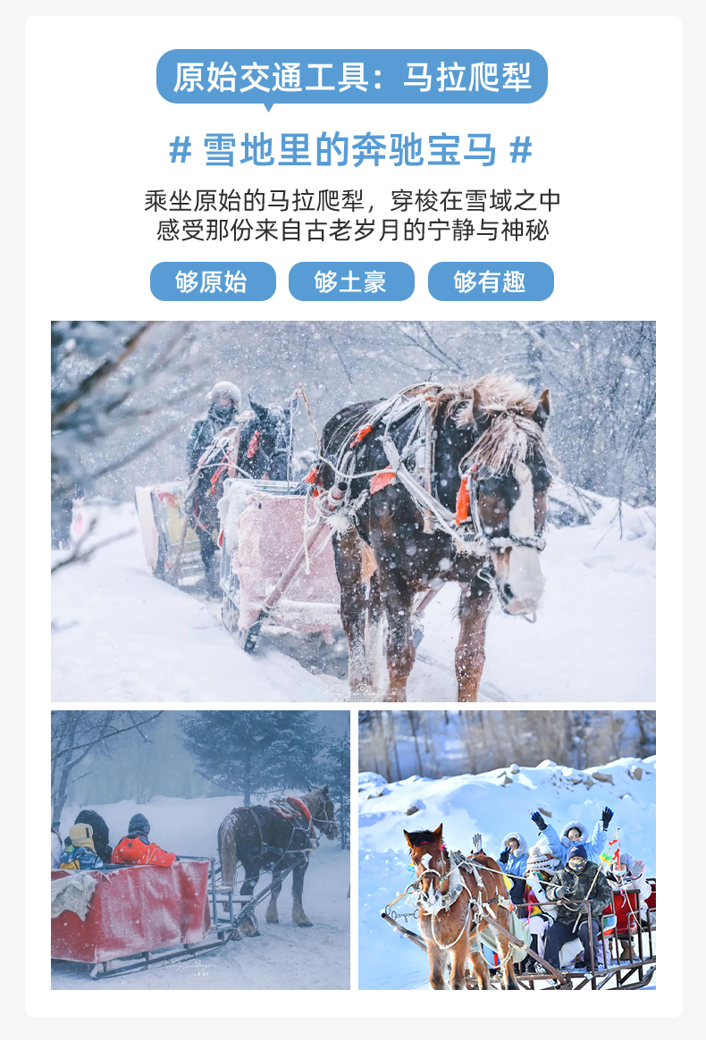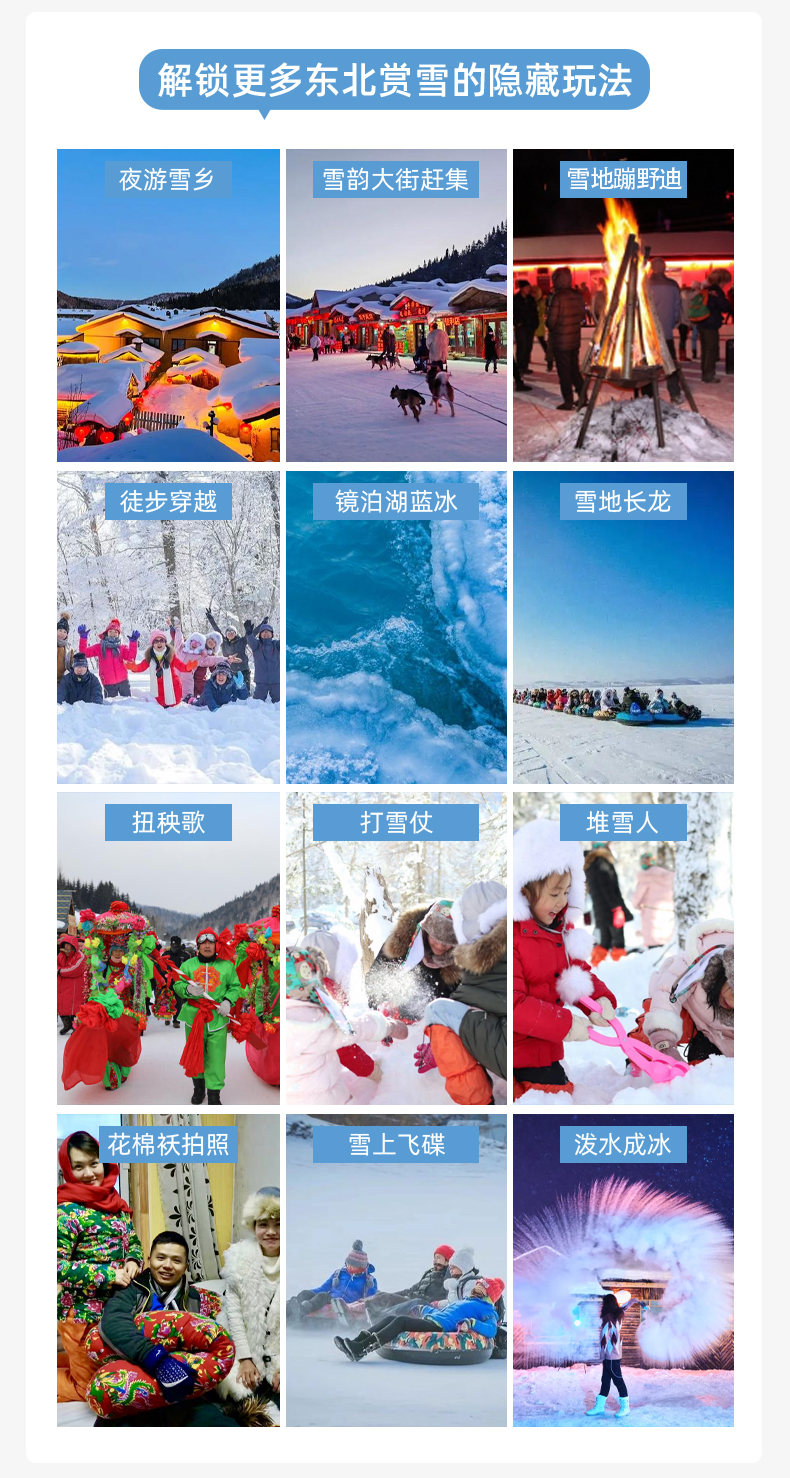 滑雪温泉 雾凇漂流 寒地冬捕 雪山徒步 雪地摩托 马拉爬犁 民俗体验