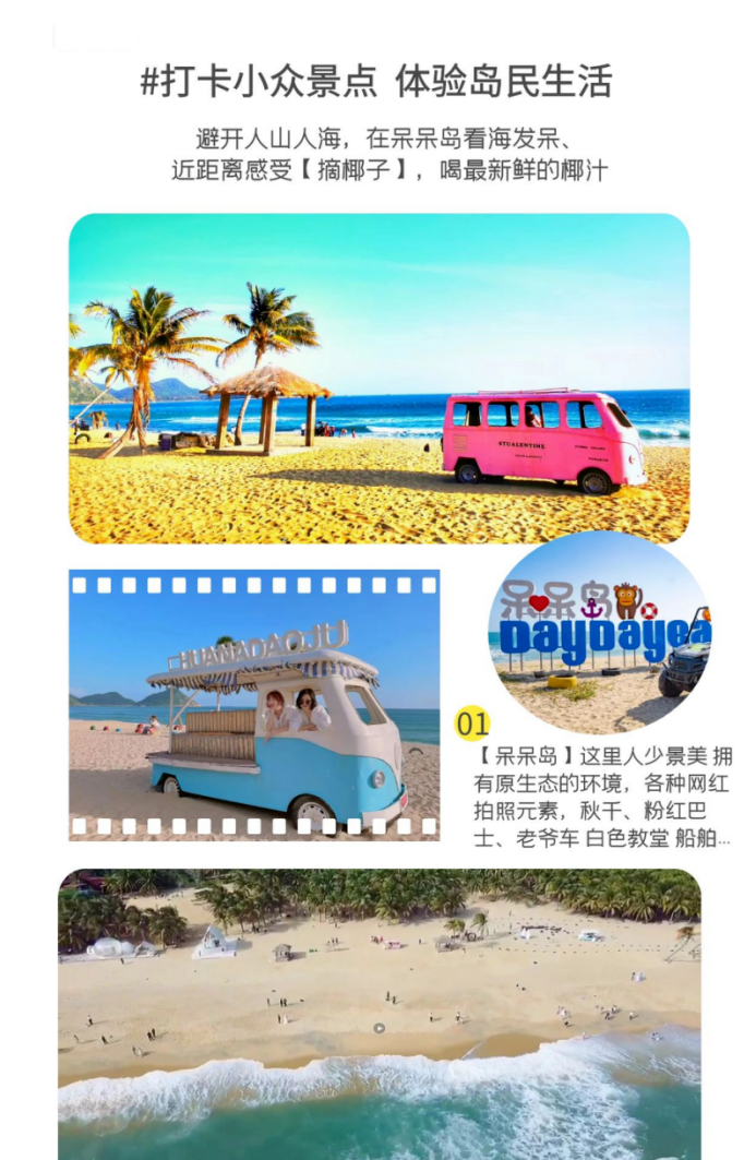 中午抵达海南最美户外海岛【呆呆岛】呆呆岛人少景美,是一片最原始、最生态、最静谧、最情怀的绝美之地。这里还是新晋网红拍照地,拍一组清新风格的照片也是美美哒,因为这里有足够多的元素,巴厘岛款的网红秋千、粉红巴士、白色老爷车、白色教堂、通往海里的指路牌、船舶……各式各样网红拍照道具散落在沙滩上,清新的色彩、浪漫的环境,此时此刻,最想做的就是能与心爱的人一起记录下这美好的一刻,为旅途、为生活增添浪漫的色彩。阳光、沙滩、椰林、大海在午后时光的感受度假的乐趣。在这里还可以自行体验摩托艇、香蕉船、冲浪等娱乐项目和大海来一次亲密的接触。之后前往三亚酒店。