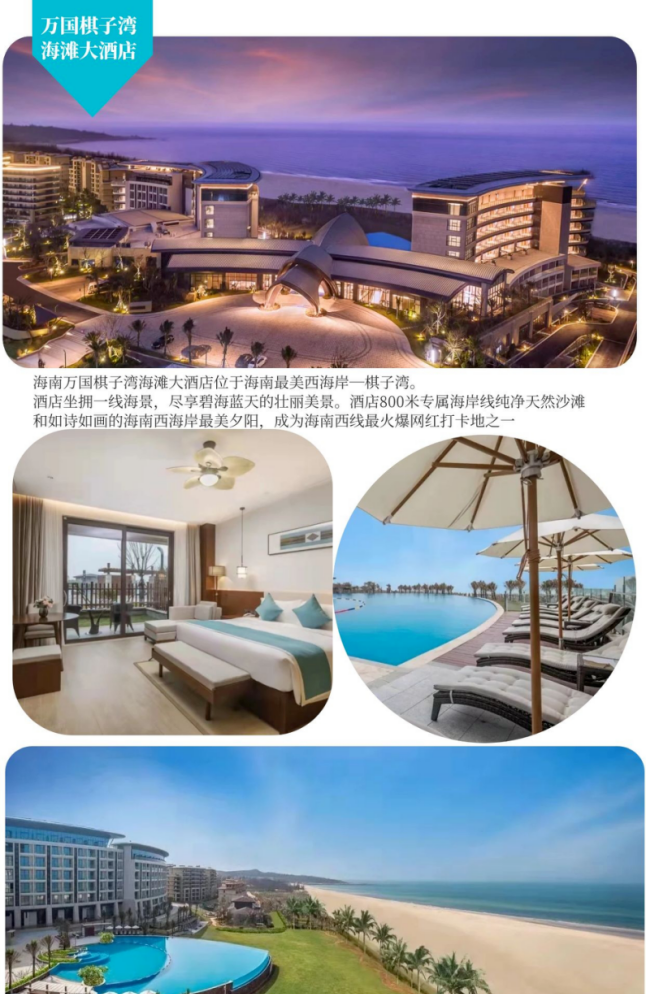 入住酒店: 2晚品质舒适酒店+2晚当地较好酒店+1晚五星级万国棋子湾海滩大酒店海景房或者碧桂园金沙滩温泉酒店或同级