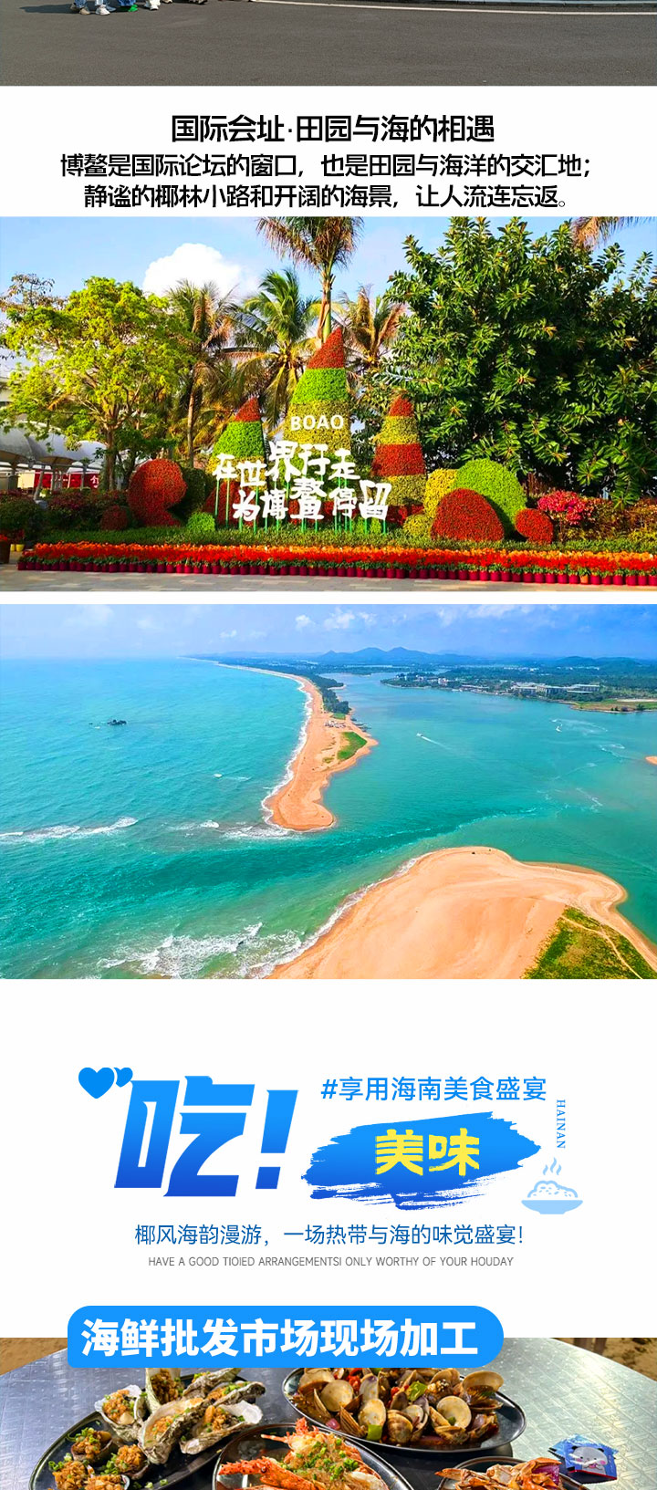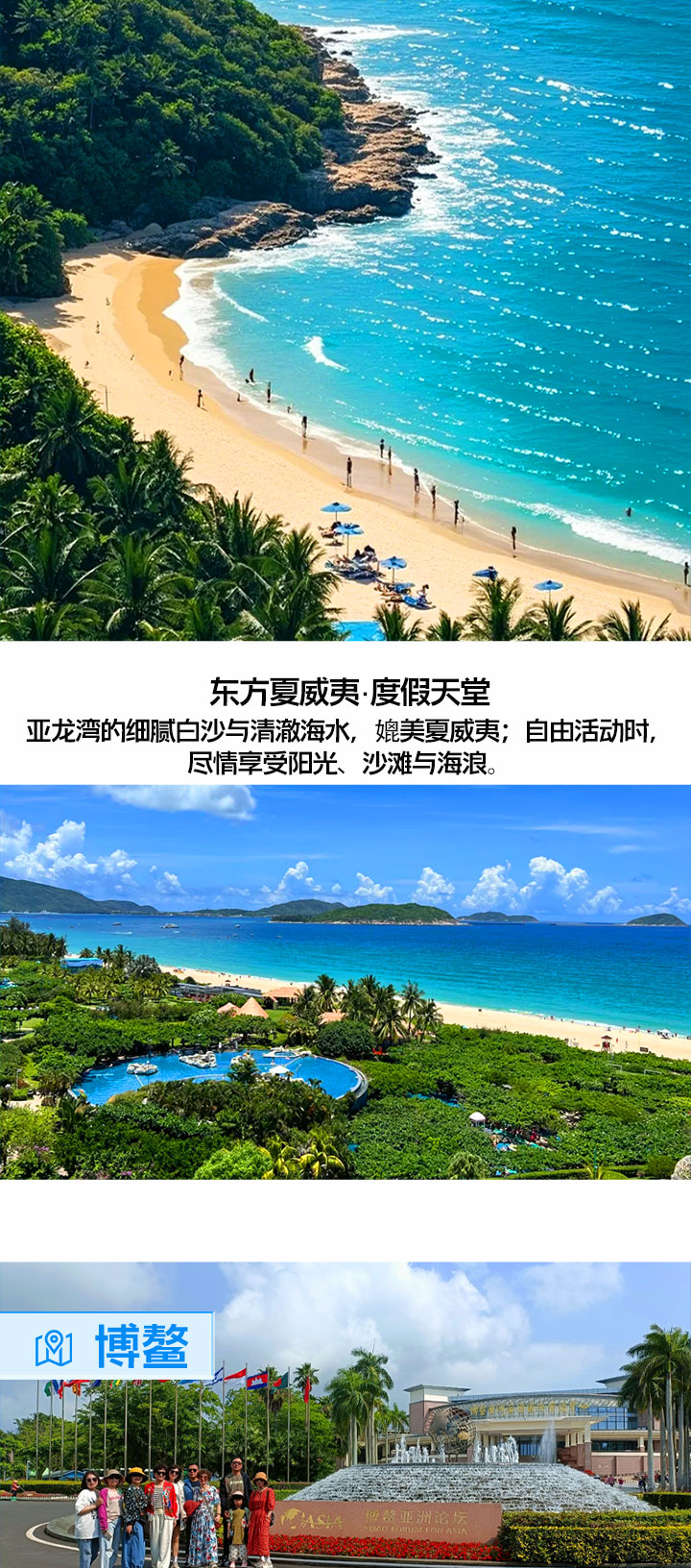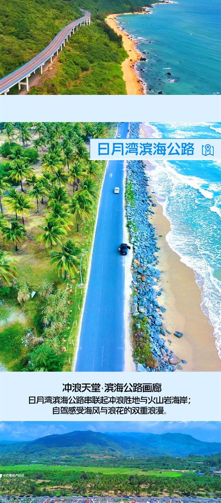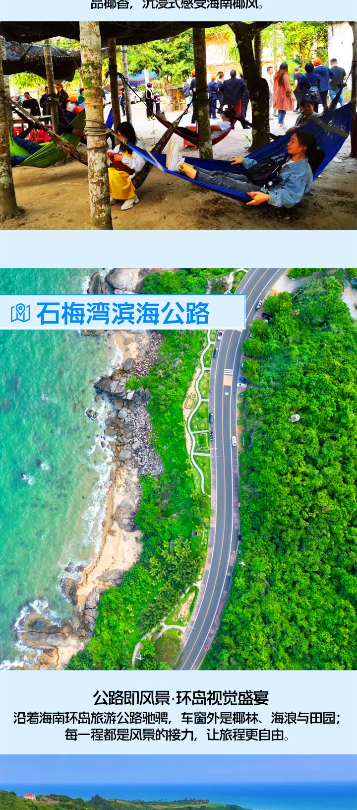 上午从博鳌离开琼海,途径海南最美【旅游公路】,感受热带海岛风光,领会自驾真谛—最美在路上,继续前往日月湾【滨海公路】感受椰风海浪。