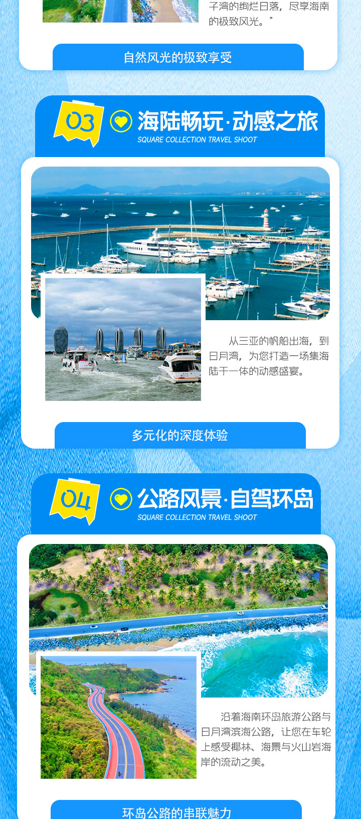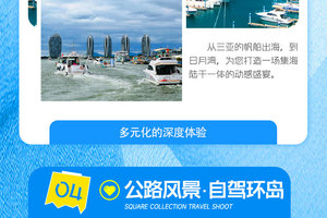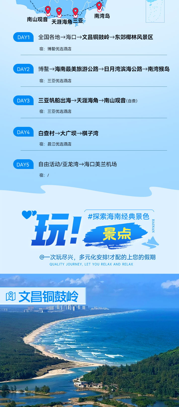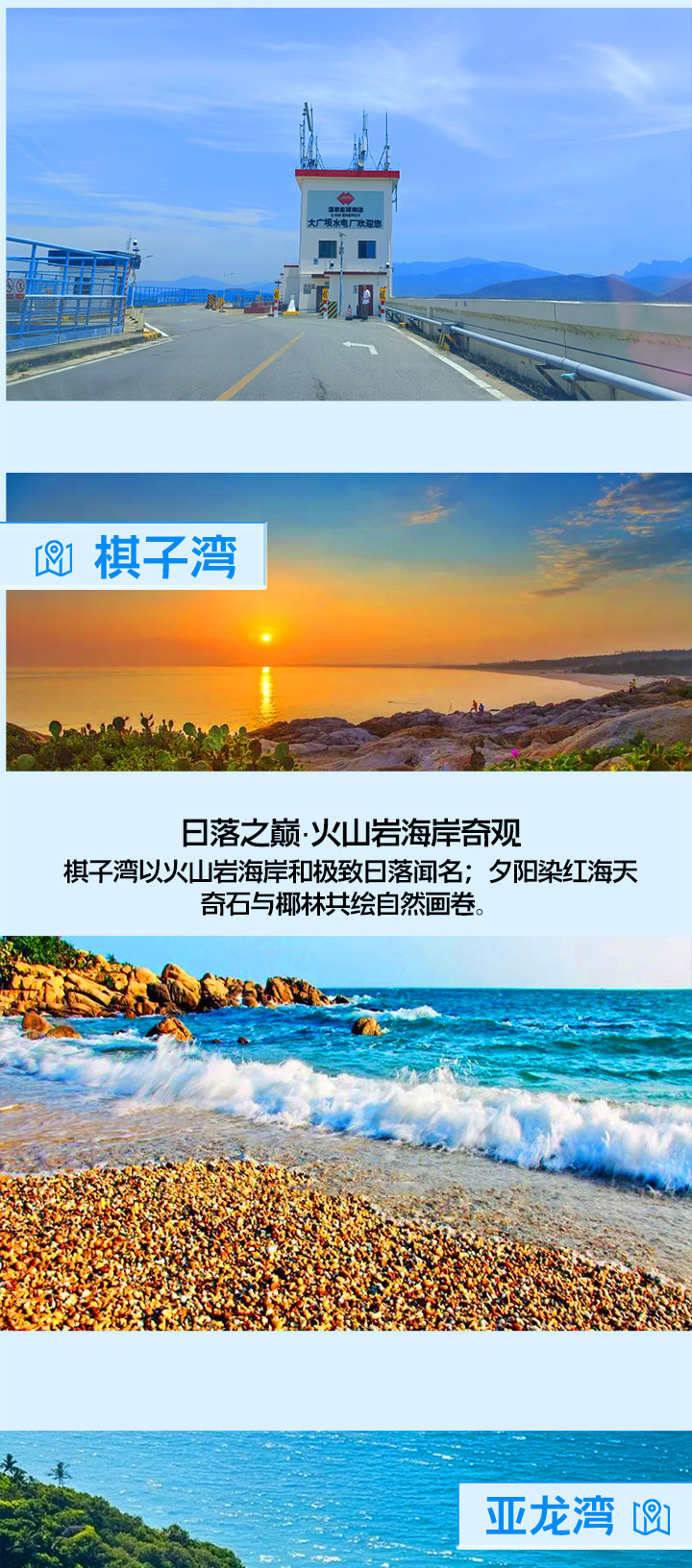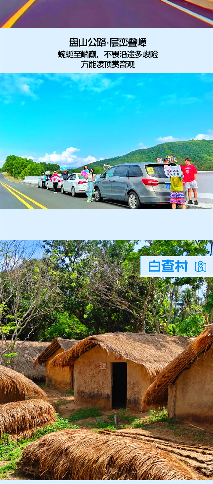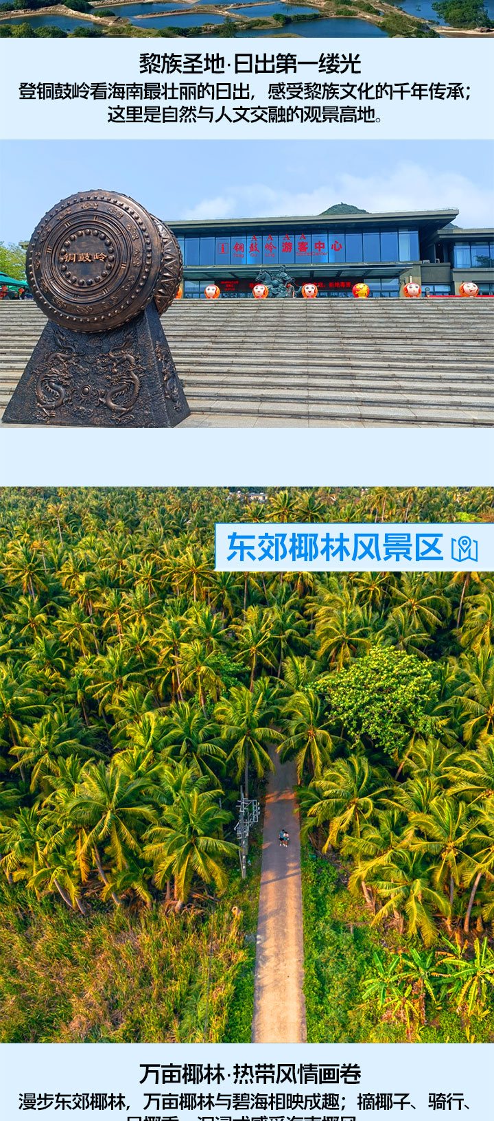 上午从博鳌离开琼海,途径海南最美【旅游公路】,感受热带海岛风光,领会自驾真谛—最美在路上,继续前往日月湾【滨海公路】感受椰风海浪。