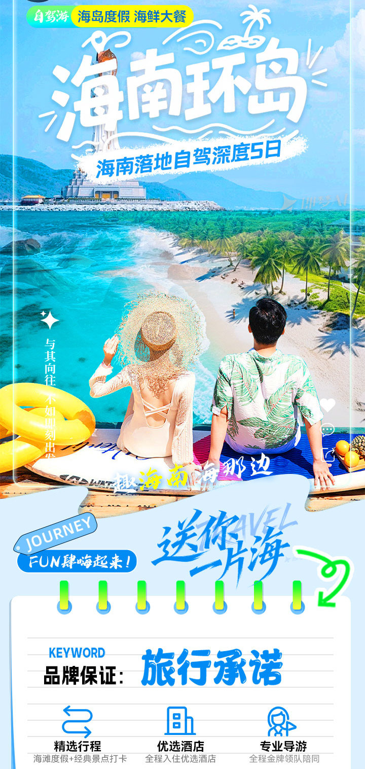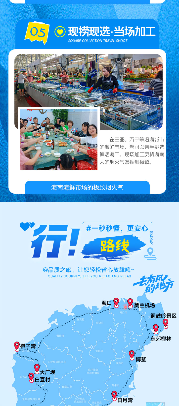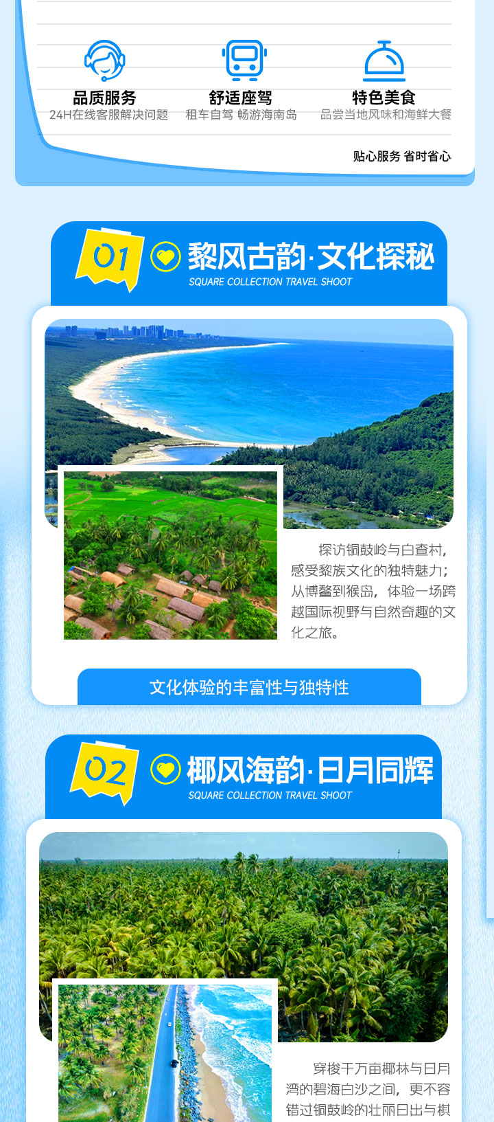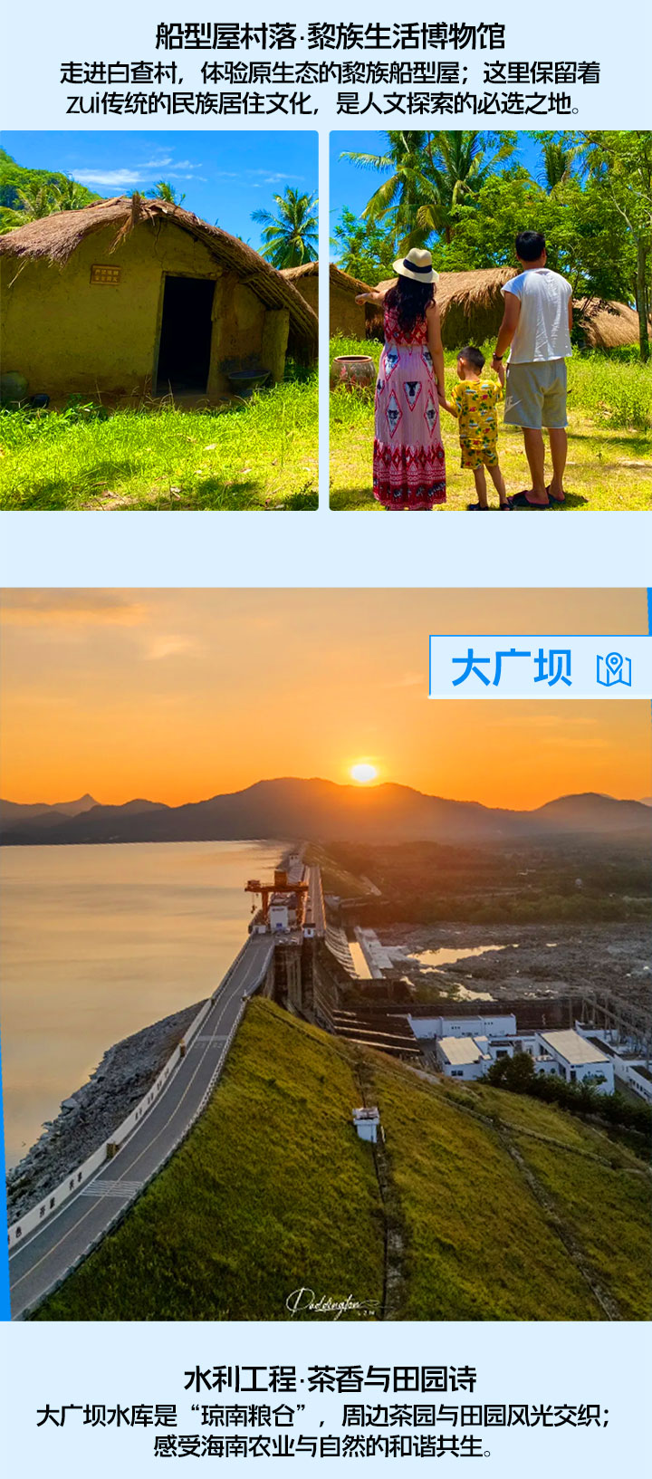 上午从博鳌离开琼海,途径海南最美【旅游公路】,感受热带海岛风光,领会自驾真谛—最美在路上,继续前往日月湾【滨海公路】感受椰风海浪。