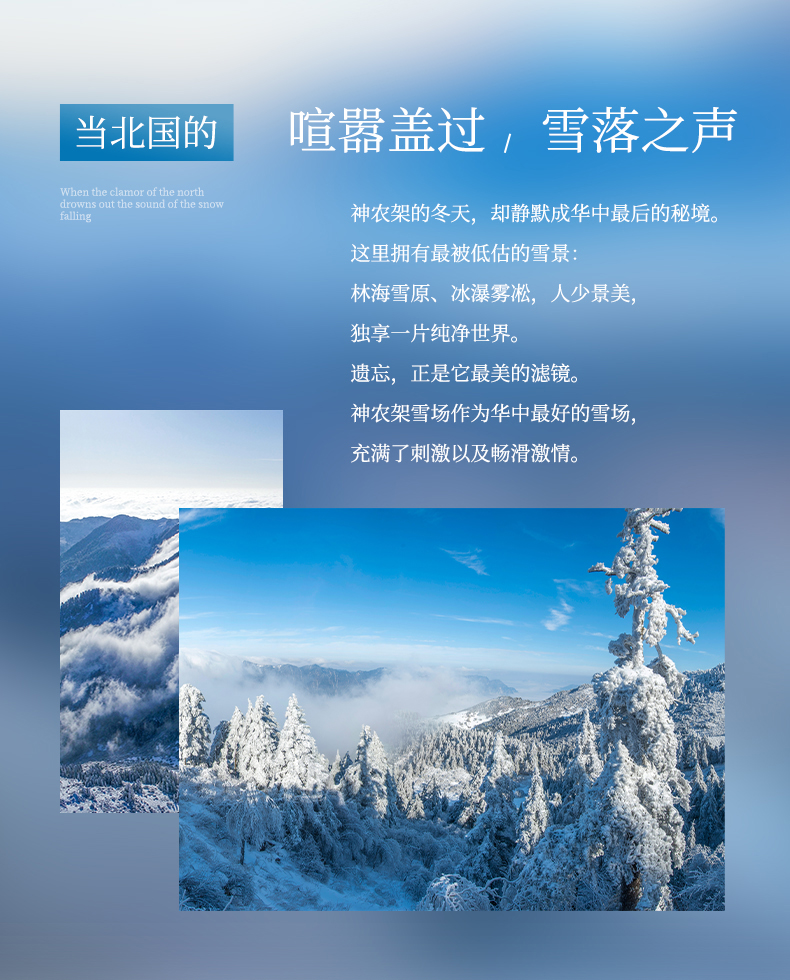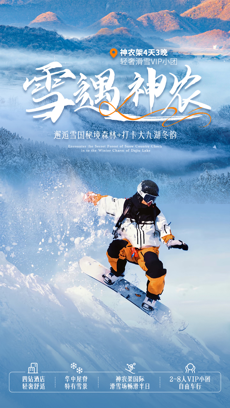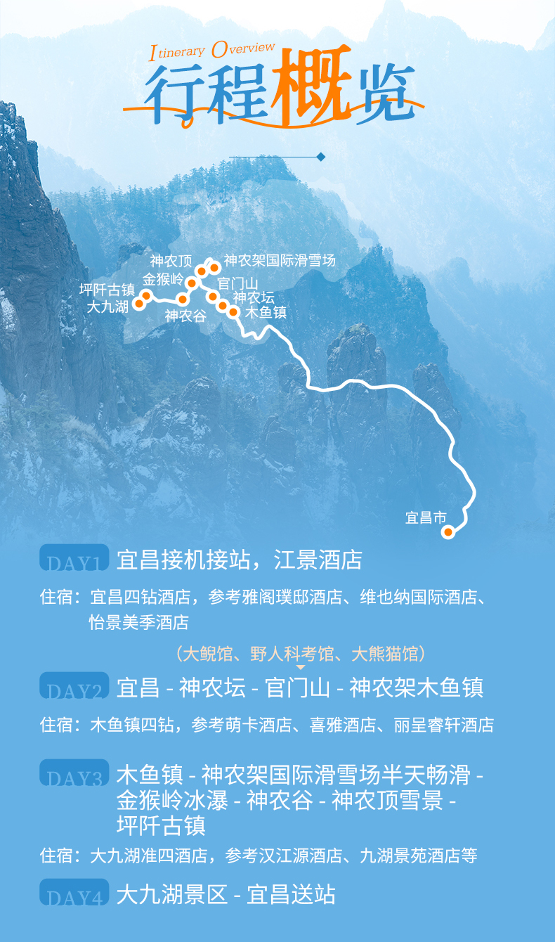 木鱼镇—神农架滑雪场滑雪—金猴岭(冰瀑)—神农谷-神农顶(雪景)—坪阡古镇;