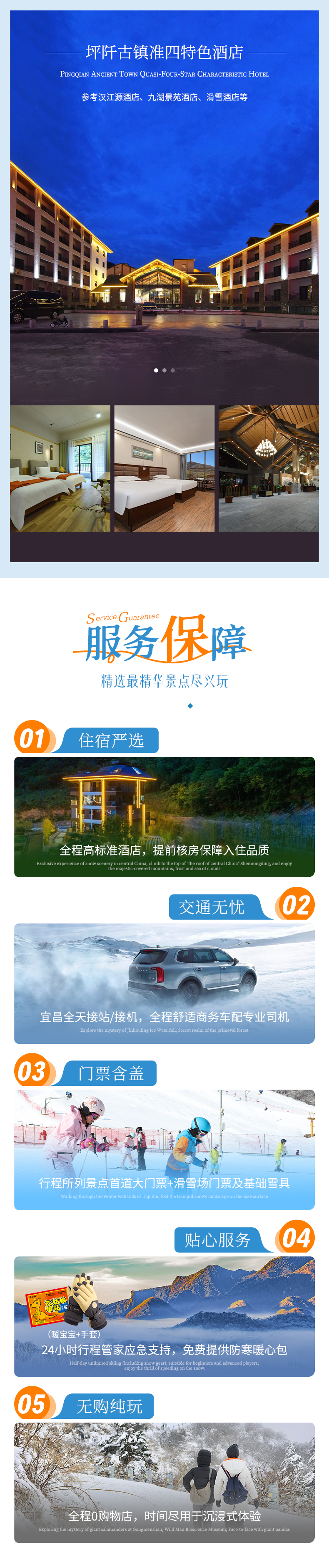 2. 住宿:宜昌四星酒店一晚;神农架木鱼四钻住宿一晚、坪阡古镇准四住宿一晚;