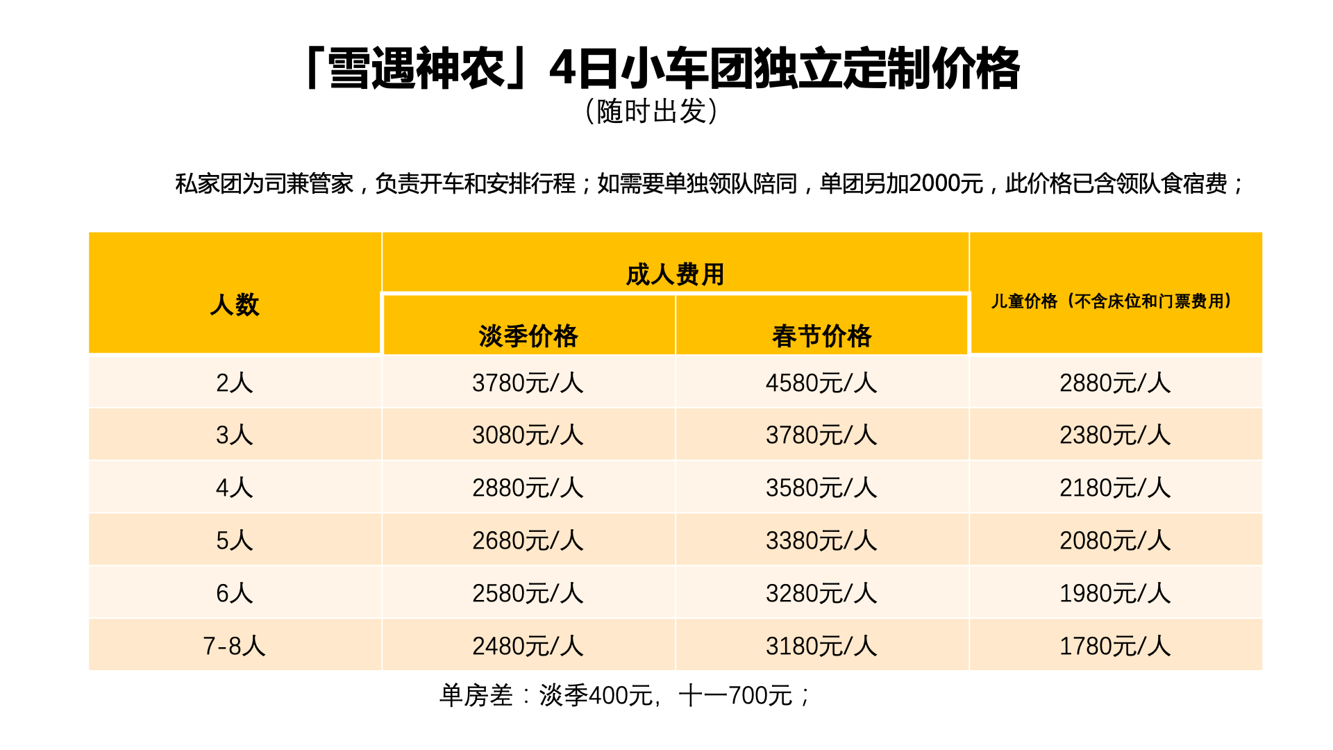 3.个性化消费,比如神农架滑雪雪服租赁35-100元一套、头盔20元一个、滑雪手套16元一个、寄存柜25元一个、滑雪眼镜30元一副等,另外不含滑雪专业教练费用(根据人数定价);我们滑雪包含的是双板或单板全天滑雪,如果需要中途换板,多出来费用自行支付;