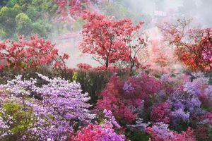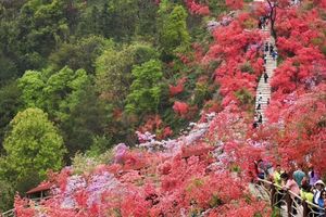 杜鹃花是中国十大传统名花之一,也是大别山区花中皇后。多彩的杜鹃花始终闪烁于满山野。4月,正是岳西天峡杜鹃花盛开怒放的季节,天峡风景区的杜鹃花别样红。花丛茂盛,花影绰约。站在观景台上向下望去,如云似霞。七彩的花团如同给大别山穿上了一件艳丽夺目的外衣。如此景象,在实属难得一见。