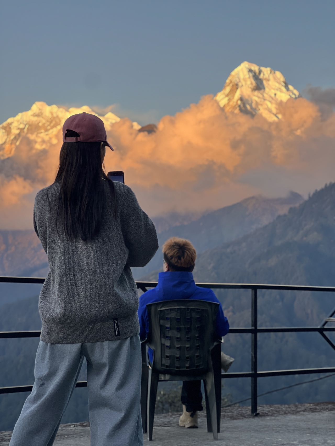 在观景台依次看到道拉吉里峰、安娜普尔娜一峰、安娜普尔娜南峰、鱼尾峰等……感受喜马拉雅群山的震撼。徒步40分钟左右返回客栈,早餐后开始下山,途中经过另一个观景平台,继续欣赏安娜普尔纳群山。