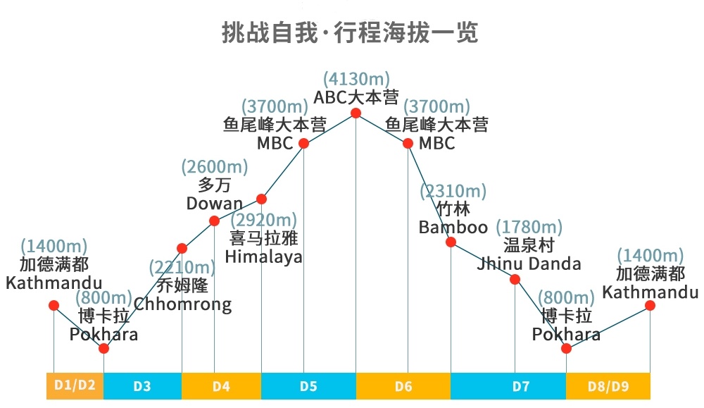 全程徒步58公里左右,平均海拔约2300米,徒步最高海拔为安纳普尔纳大本营4130米左右。此线路沿途路况较为原始,参与者务必拥有良好的心理素质与身体素质,且需具备多年的高海拔户外经验,户外小白请勿参加。