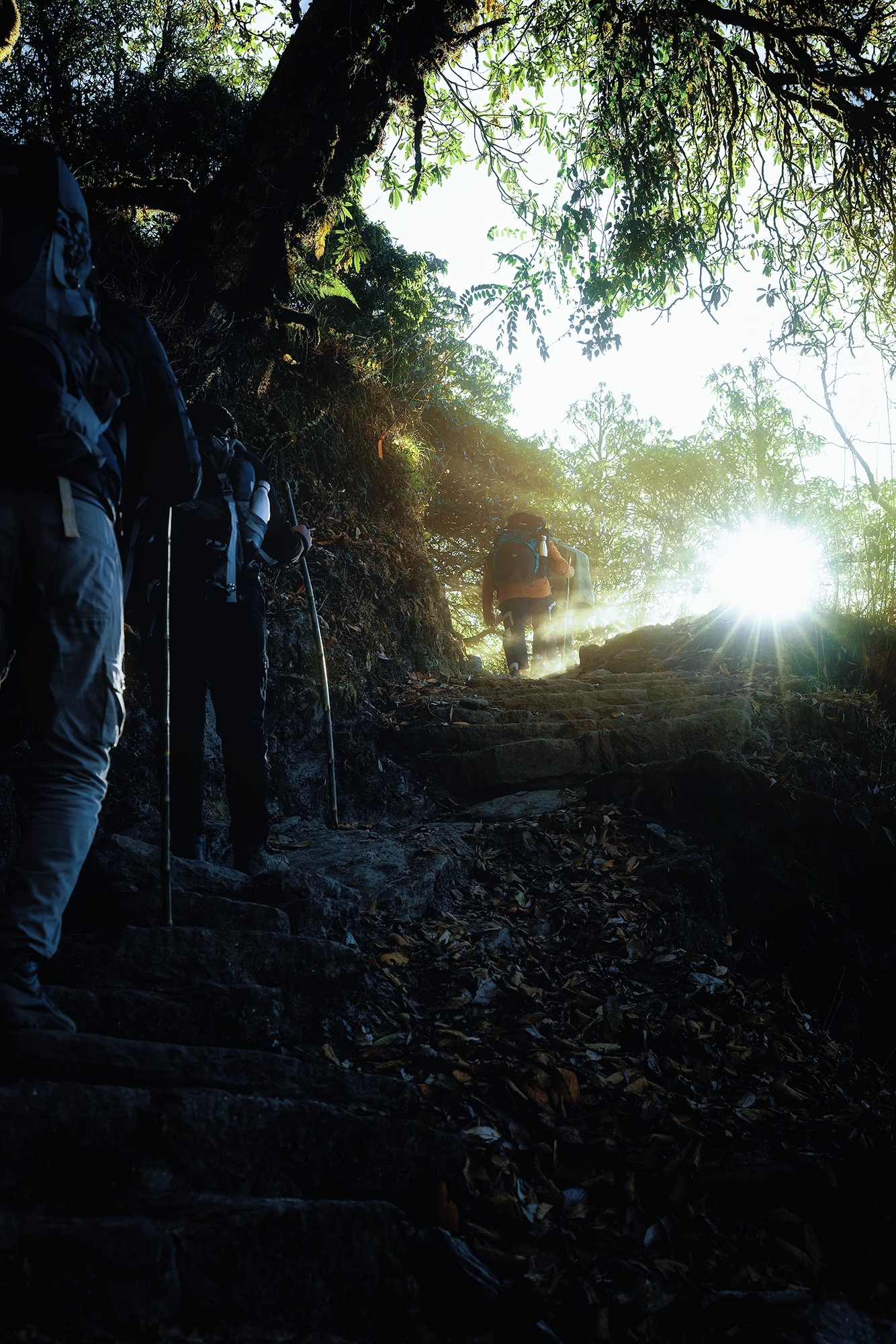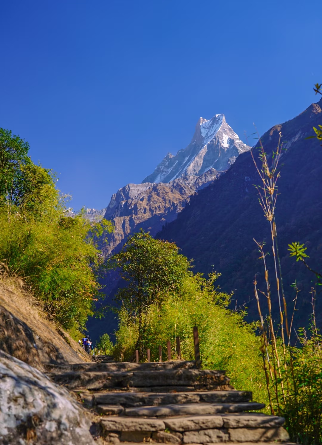 今日全程几乎都要一直爬升,路程比较艰苦但景色非常漂亮!长时间穿行在杜鹃遍布的密林中,前半段起伏较缓、路面松软、林叶遮蔽、空气清新,溪水潺潺,不晒不热又能饱览美景。鱼尾峰不时钻出林叶缝隙跃入眼中,幸运的话还能看到喜马拉雅灰叶猴,人与自然和谐共生在这里体现得异常明显。最后抵达德瑞利Deurali位于河谷间山腰的客栈。