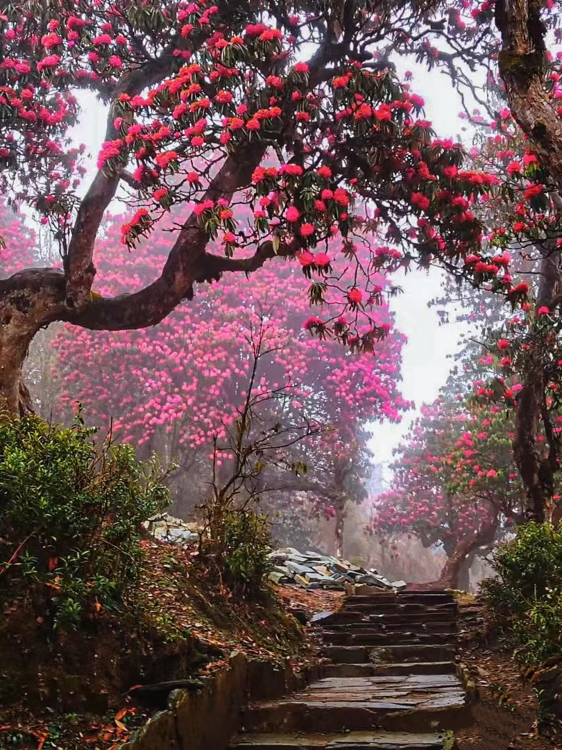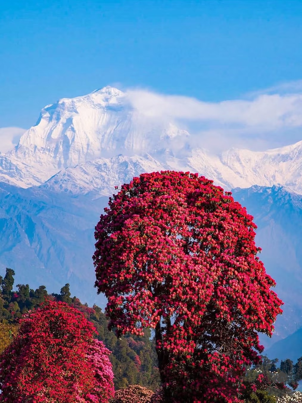 雪山王国尼泊尔,藏着世界级的春日浪漫!每年3月中旬至4月初,是杜鹃花的盛花期。从低海拔山谷到雪山脚下,各种珍稀高山杜鹃如云霞绽放,粉紫艳红交织成海,与圣洁雪山、飘扬经幡构成独特的自然奇观,本届尼泊尔徒步大会正是奔赴这场盛宴的最佳时节。