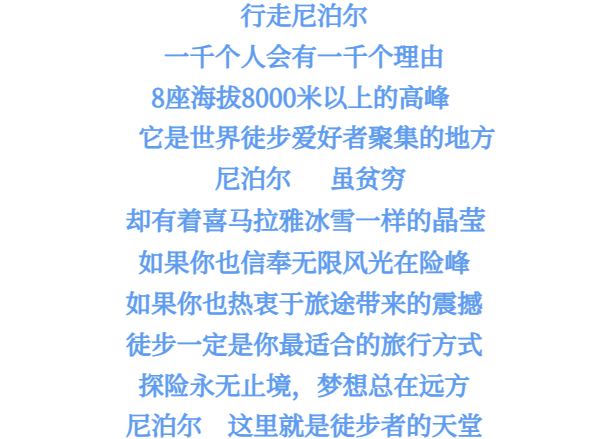 2.海拔最高3210米,植被丰富,几乎无高反情况,适合各种体力的队友,所有团队皆可报名参加活动。 3.全国最大规模的尼泊尔徒步大会,强大的保障团队,优秀领队与协作竭诚为您提供徒步过程中的一切帮助。 4.沿途配套设施完善。180度观景平台,观赏道拉吉里峰的最佳位置,安娜普尔娜群山与鱼尾峰一览无余。 |