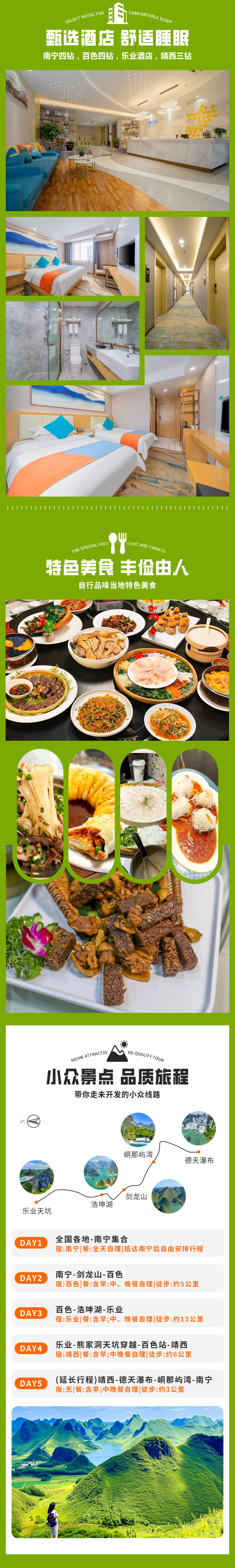 2.住宿:南宁携程四钻酒店,百色携程四钻酒店,乐业酒店,靖西三星酒店,单人报名组织方优先安排同性拼,如遇到无同性法拼房4天需要补房差300元,5天需补房差400元)