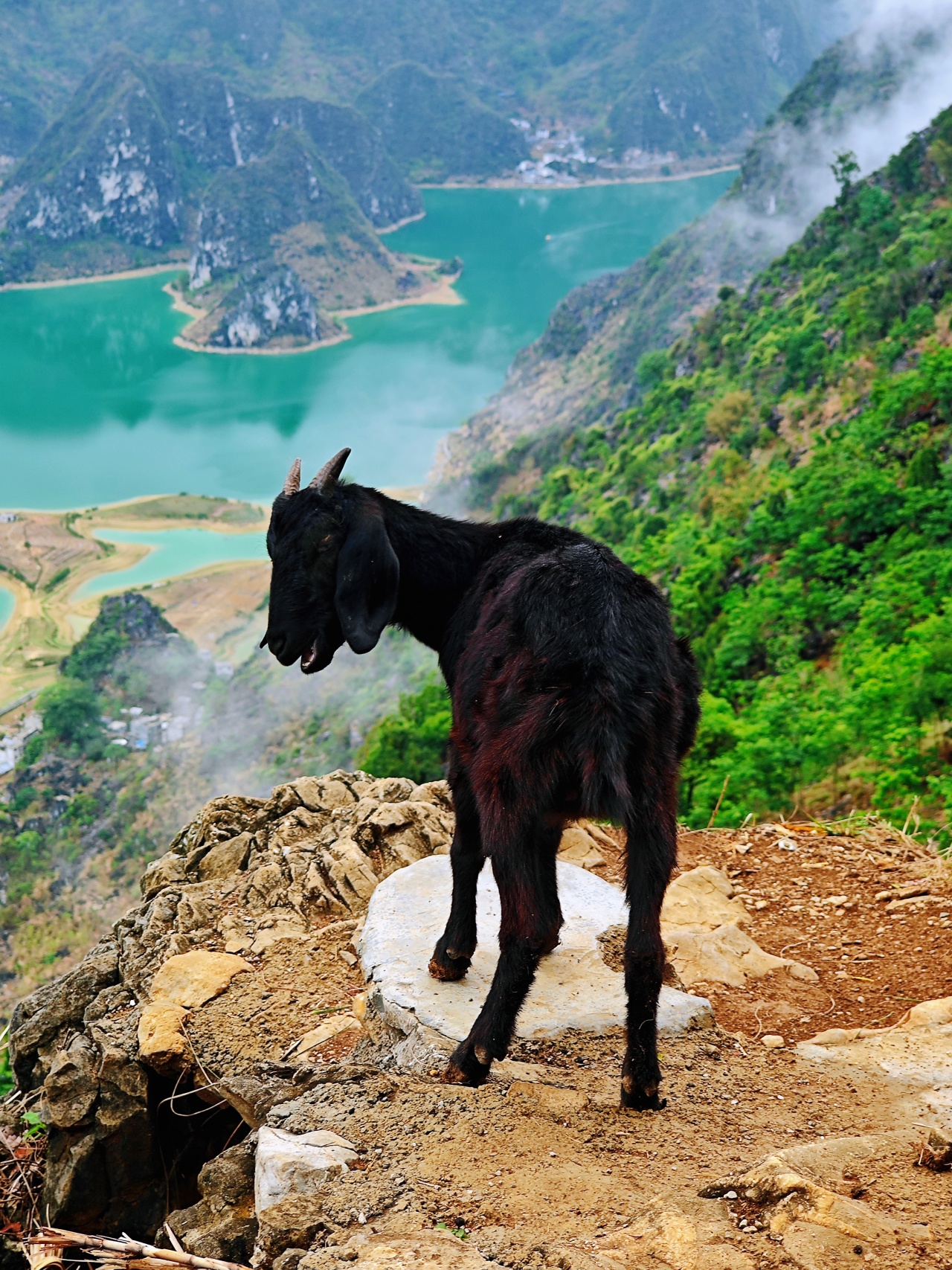 站在剑龙山的山巅,极目远眺,四周山峰起伏,满目的苍翠,令人心旷神怡。还有镶嵌在峰林中的水库,静静地如同一块蓝宝石