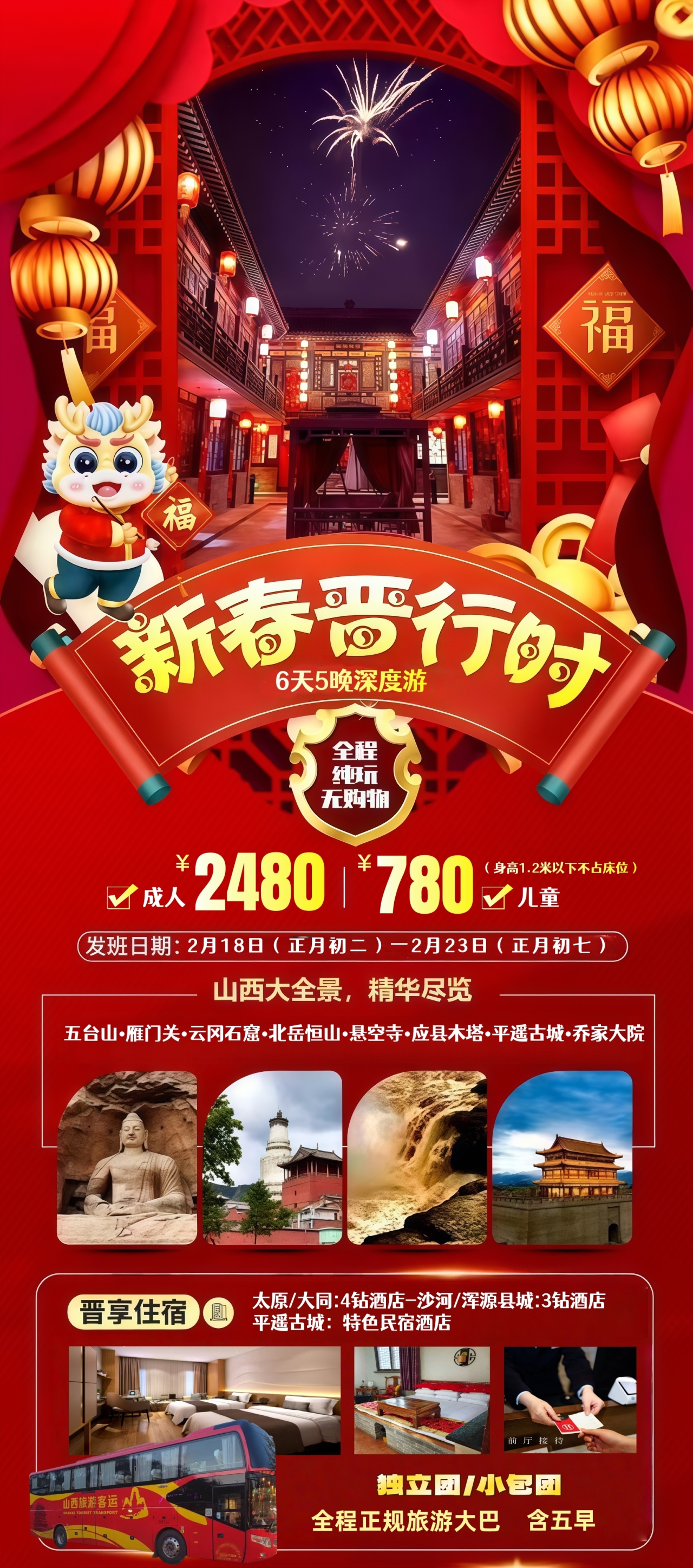 7点早餐后,前往应县木塔,站着等你969年,看一眼少一眼之应县木塔,梁思成先生魂牵梦绕的“第一国宝”游玩2小时之后,前往平遥古城,到达之后安排入住古城内民宿,由于过程很大,领队统一讲解游玩顺序,之后自由活动,穿越时空的晋商旧梦 ,青砖灰瓦,红灯高挂,一座城,一场千年梦,畅游古城。