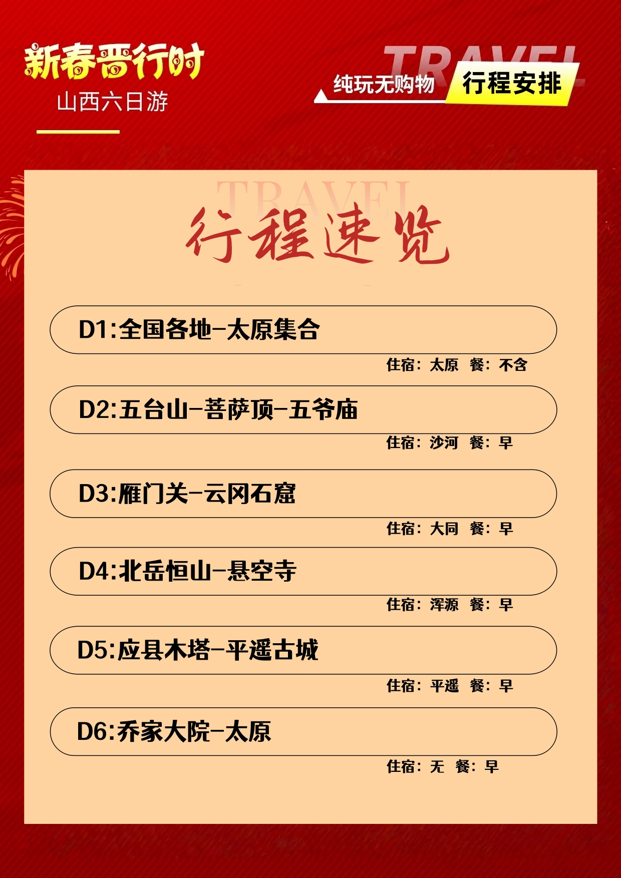 2)山西部份路段有可能碰到修路或天雨封路绕行,我们有权根据实时路况进行调整线路。