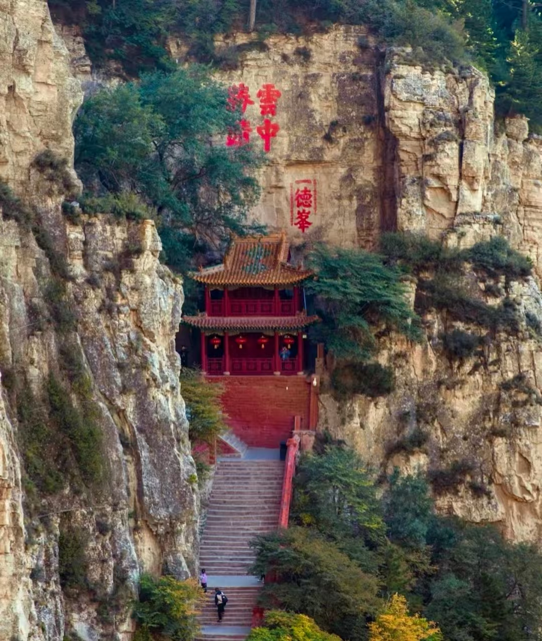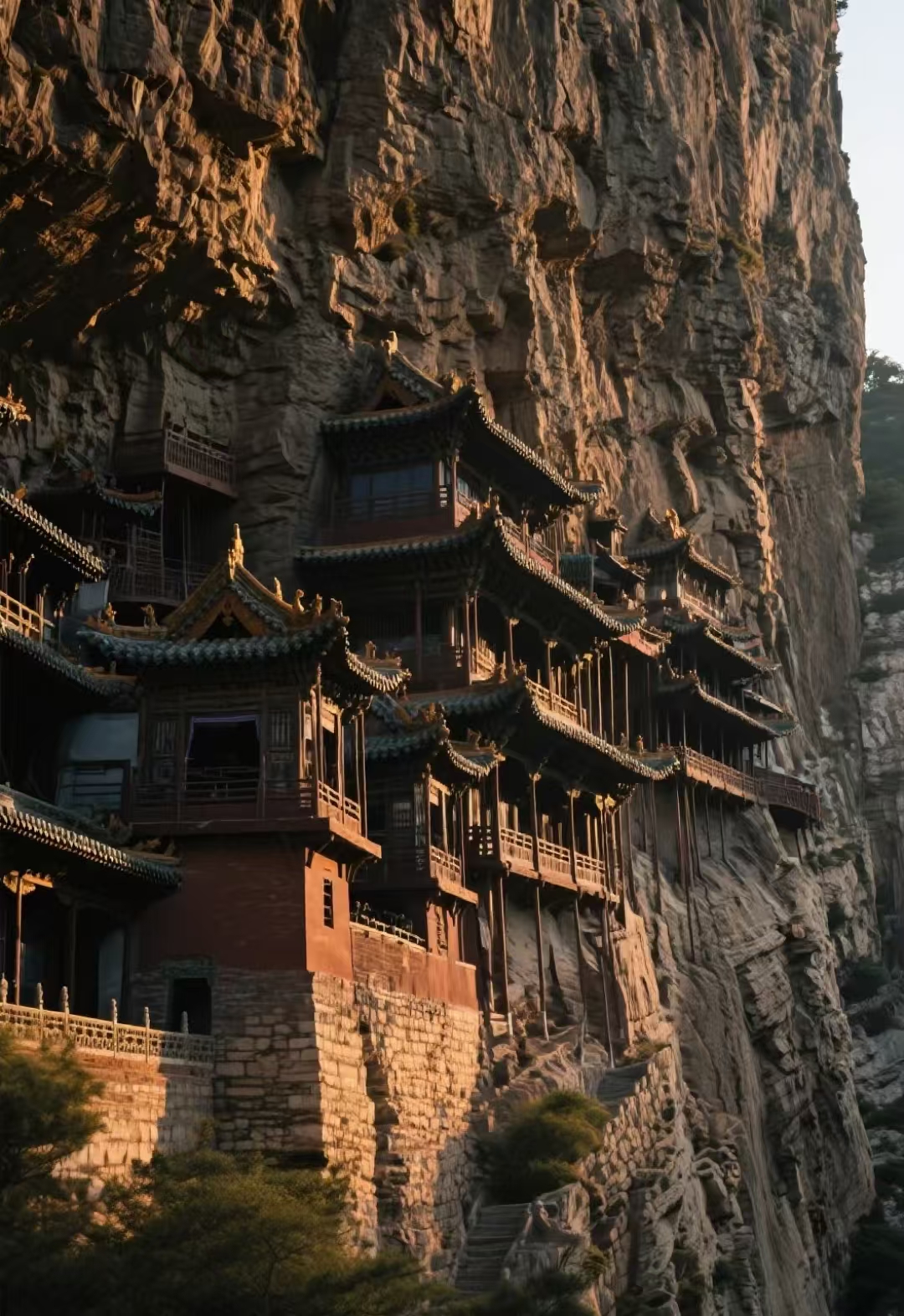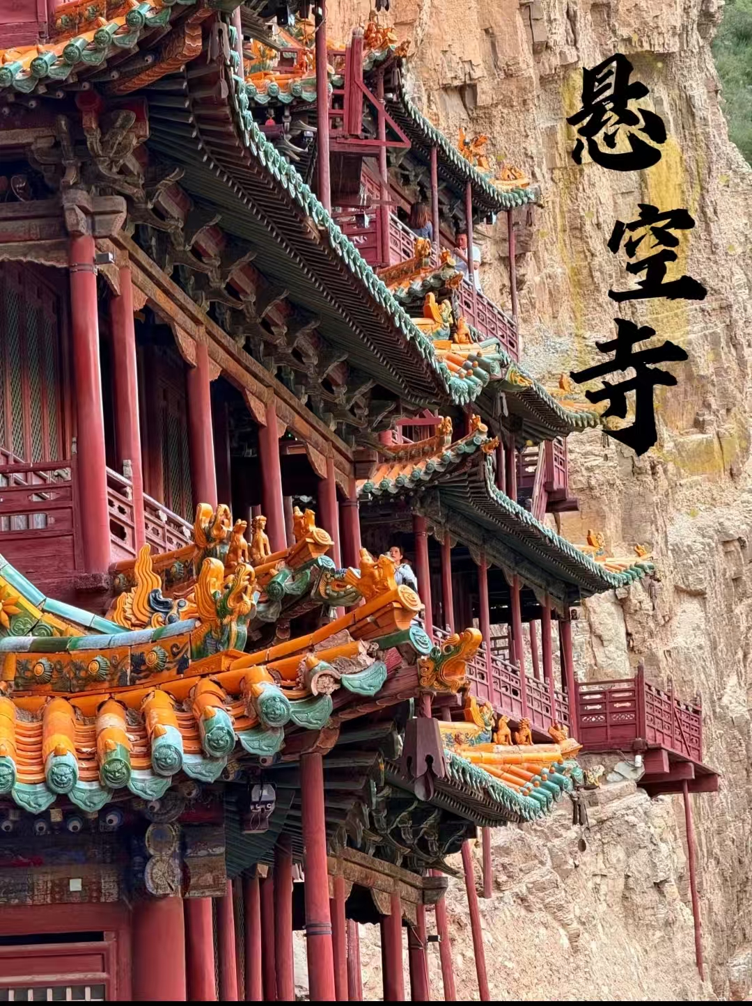 这座北魏天师道营造的空中奇观(公元491年)以「半插飞梁为基,巧借岩石暗托」的悬挑智慧,用152根木柱支撑起40间殿阁的立体楼阁,全寺无钉无铆,2700吨木构榫卯咬合如骨,唐开元二十三年大修时,李白醉书「壮观」二字劈裂岩壁,明弘治年间以铁索加固悬臂,清同治年间修葺时嵌入北斗七星镇煞,梁思成称其为「中国古建筑力学奇迹」。