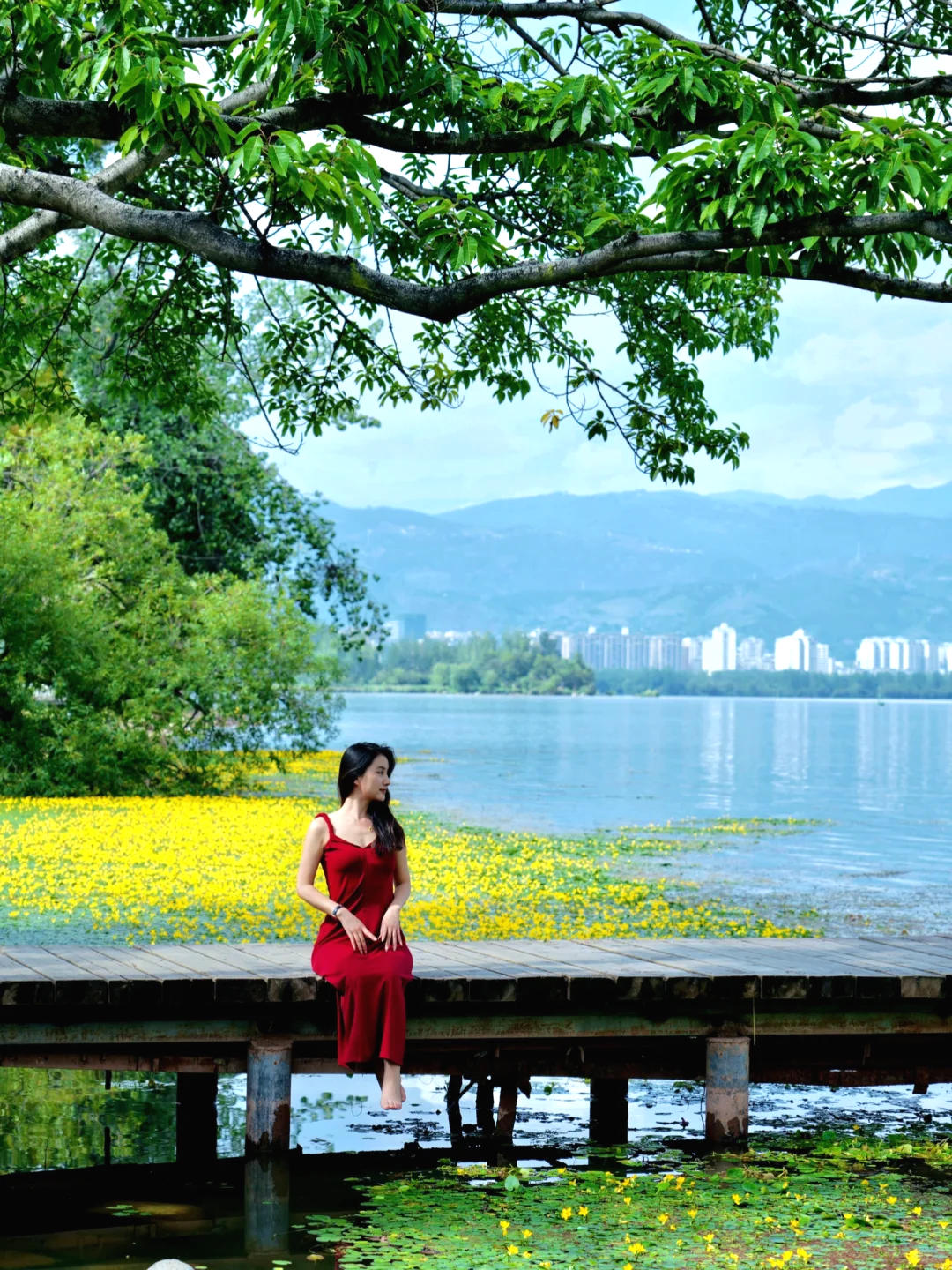 整个【盘龙江江岸】一片紫蓝,低眉的蓝花楹是江水的霓裳衣。天空、花瓣、江水融为一体,只叹“此中有真意,欲辩已忘言”。