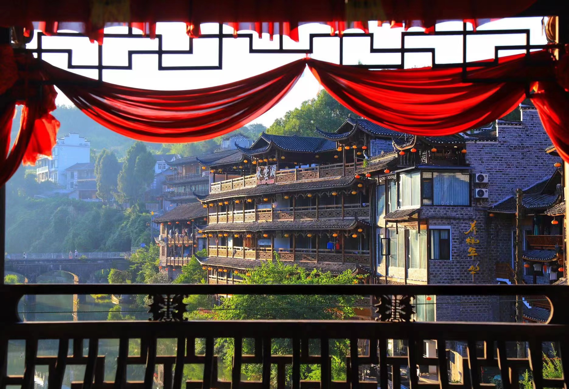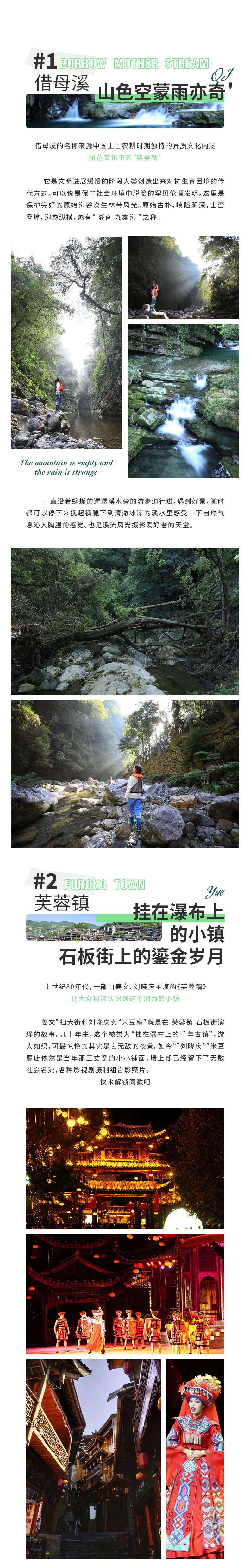 早上在崇山峻岭中醒来,用过早餐后,我们整理行装出发,最后回望一眼这深山中的宁静古村吧。今天我们将穿越到借母溪西面的【陈家溪】,一路上郁葱苍莽的珍奇树木随处可见,时缓时急的溪水,跌宕的小瀑布,大约4-5小时,我们将到达借母溪的西大门。两天一夜的穿越感慨万千,午餐后我们坐车离开借母溪,前往凤滩水库。还记得沈从文书中常提到的“白河”吗?那条原本多险滩的酉水已经被眼前这座凤滩大坝拦住,调教成了温顺的平湖。我们将在【凤滩码头】乘船,前往【芙蓉镇】。这是一种很奇妙的体验,对于湘西而言,水路才是这里最纯正的血液脉络,小溪的村民与外界的交通方式几乎全是靠船。行船在碧绿的酉水之上,船只从高山中穿过,抬头是湛蓝的天空,低头就是与之呼应的酉水,坐在船头吹吹风,再拍一张旅行时的背影。3个小时左右我们会到达芙蓉镇。入住酒店后,大家可以自行前去游玩芙蓉镇。