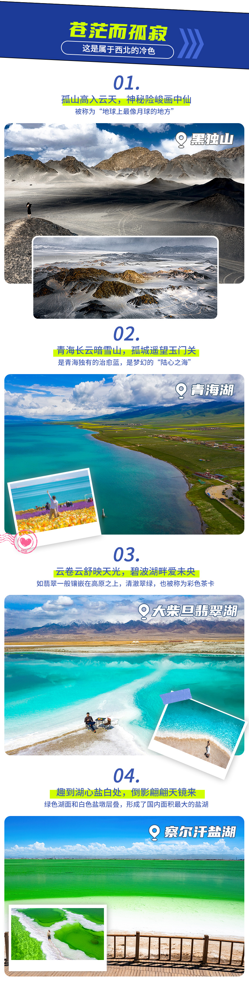 【大柴旦翡翠湖】有着青、蓝、绿各种颜色,我愿称之为内陆马尔代夫,随手拍就可以收获纯天然的青碧色和蒂芙尼蓝。抓拍一张小火车的倒影,再搭配远处的雪山,妥妥的宫崎骏动漫名场面!