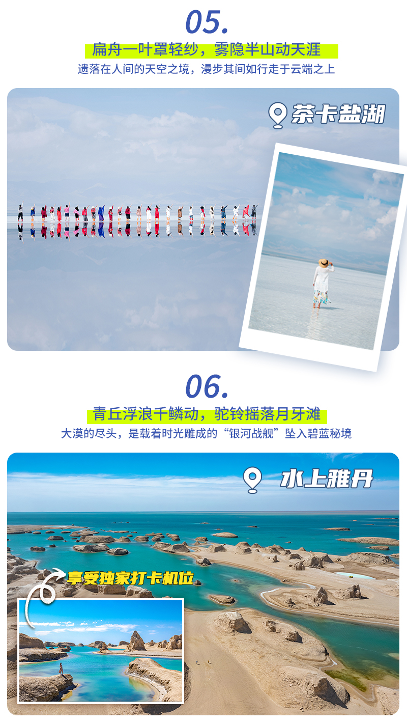 【门票】青海湖二郎剑门票(参考价:90元/人)、茶卡盐湖景交和小火车(可选,参考价格:小火车单程50元,往返100元/人)、水上雅丹门票及区间车(参考价格:门票60元/人,景交车60元/人。合计120元/人)、大柴旦翡翠湖小火车(参考价格:60元/人)、鸣沙山娱乐项目游玩费用、黑独山暂未收取门票,仅收取景交车(参考价格:60元/人)、敦煌丝路遗产城门票(参考价:60元/人)、察尔汗盐湖门票及景交(参考价格:门票40元/人,景交车60元/人。合计100元/人)。无界、大地之子为未开发景点,暂未收费,后期若收费烦请自理;