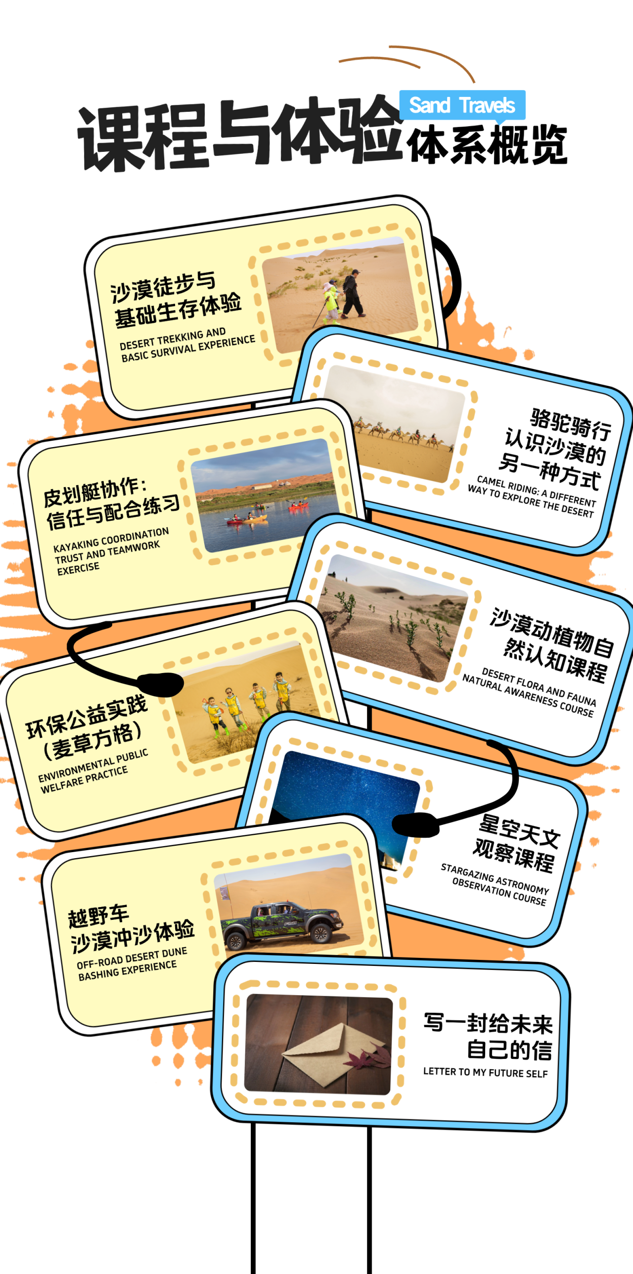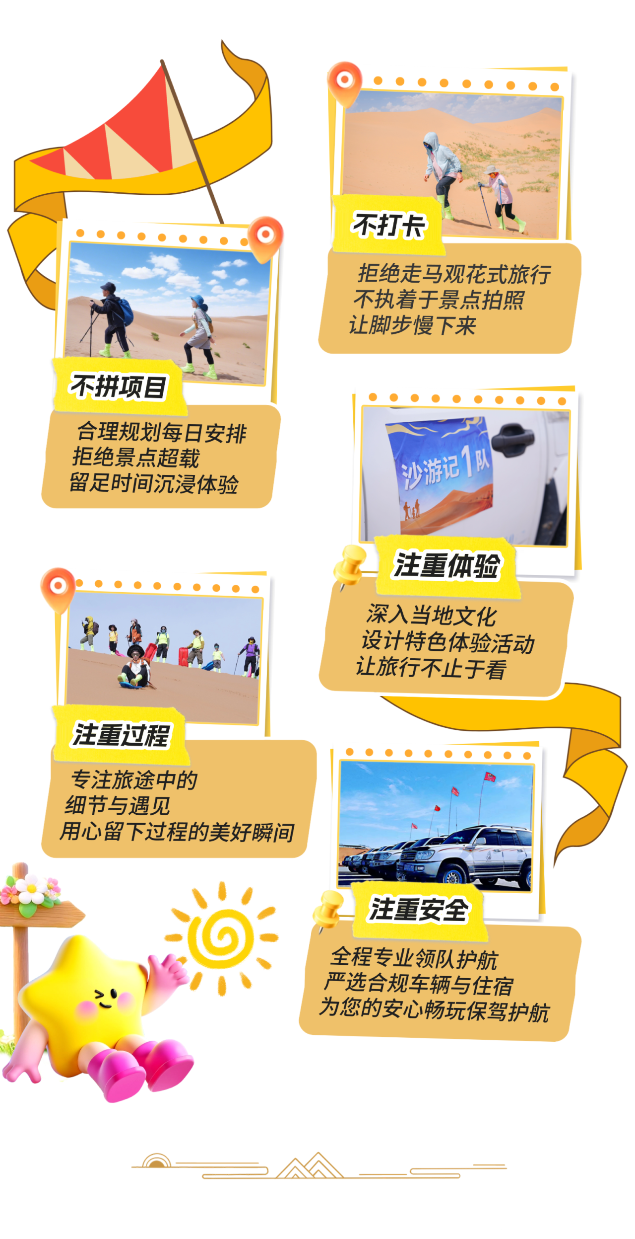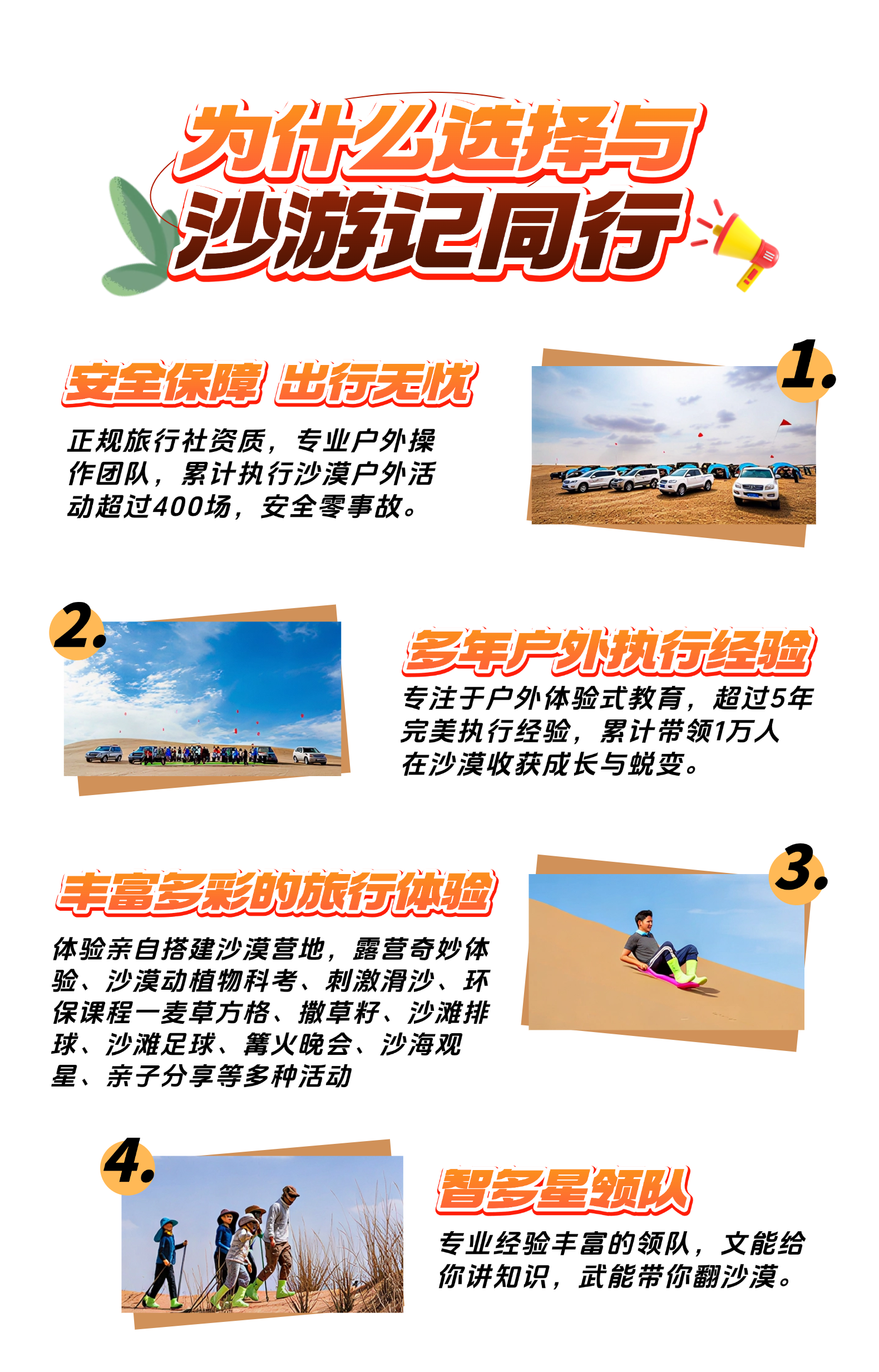 4、活动与课程:行程所列所有核心体验项目,包括沙漠徒步指导、皮划艇协作、骆驼骑行体验、麦草方格治沙实践、专业星空观测课程、越野车冲沙、滑沙体验等(具体执行按当天营地安排为准)。