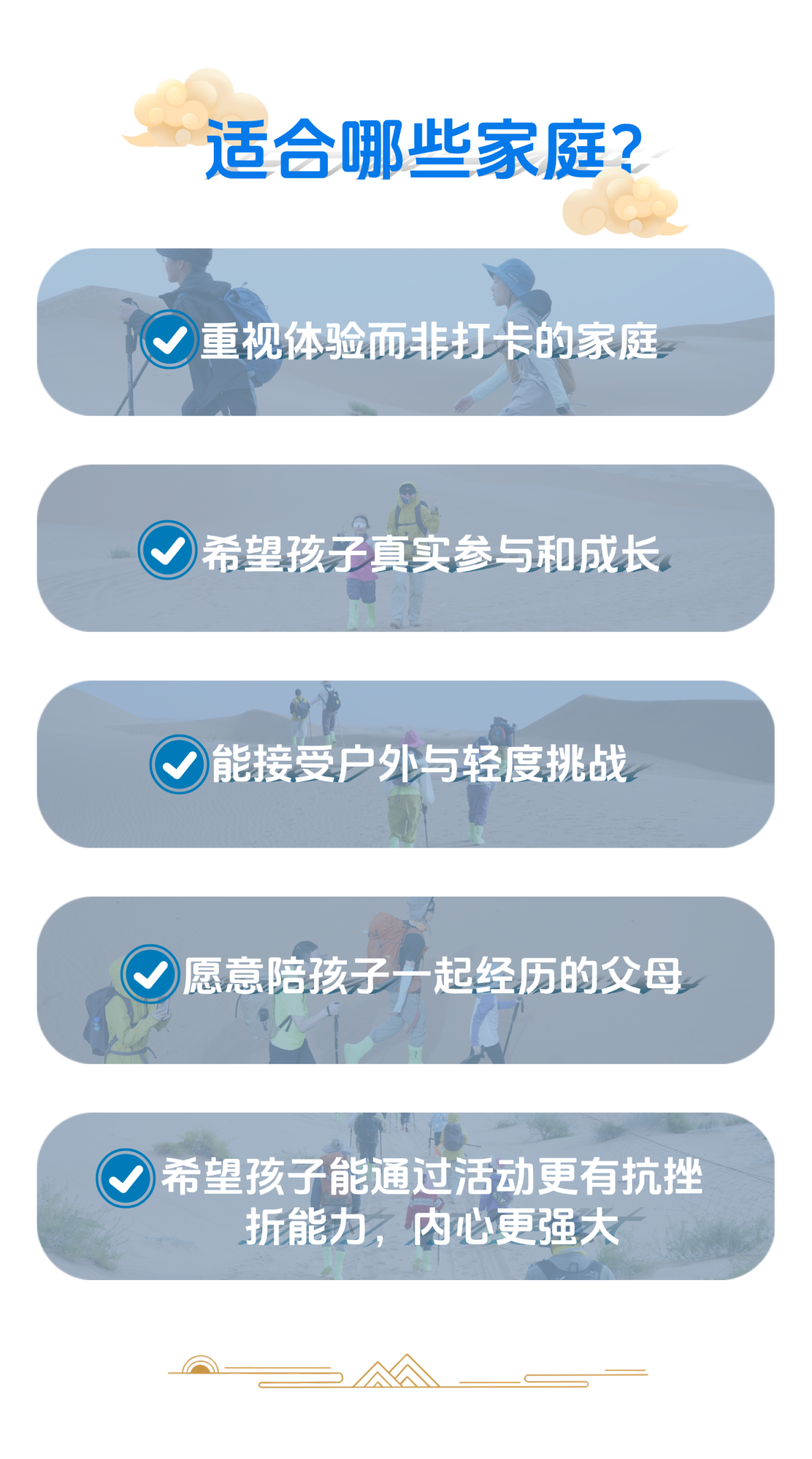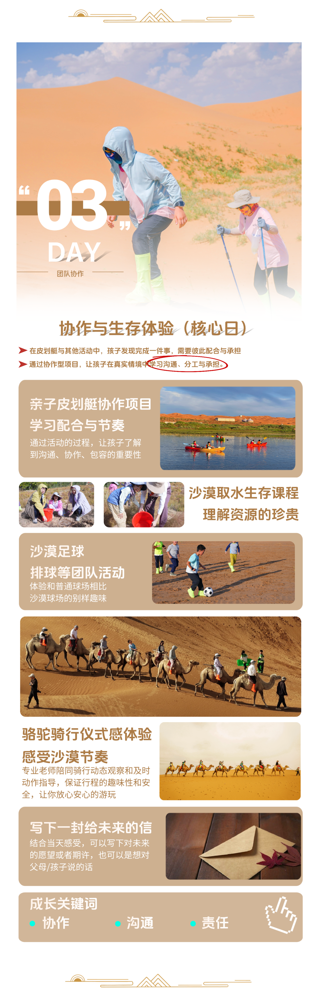 沙漠冲刺5KM:整理行装,进行最后一段徒步挑战。在最后一公里的时候,我们将看分队情况,将孩子与家长分开前行,让孩子有过一段属于自己在沙漠的独立时光,也让家长能有更多的时间和精力与沙漠来一次告别。家长在终点等待为冲线的孩子送上拥抱与鼓励。