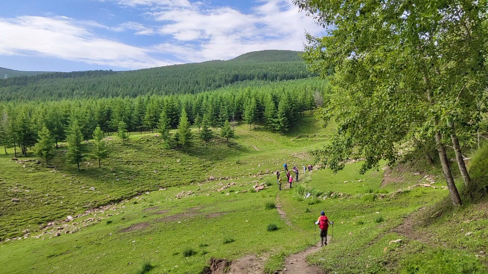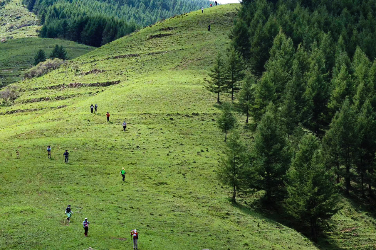 早餐后,我们开始朝拜最后一个台顶【南台锦绣峰】。沿途林荫繁茂,山花漫野,完美诠释了“锦绣”之名。在这般美景中徒步,大家放松下来,在松林与草甸间留下难忘的身影。