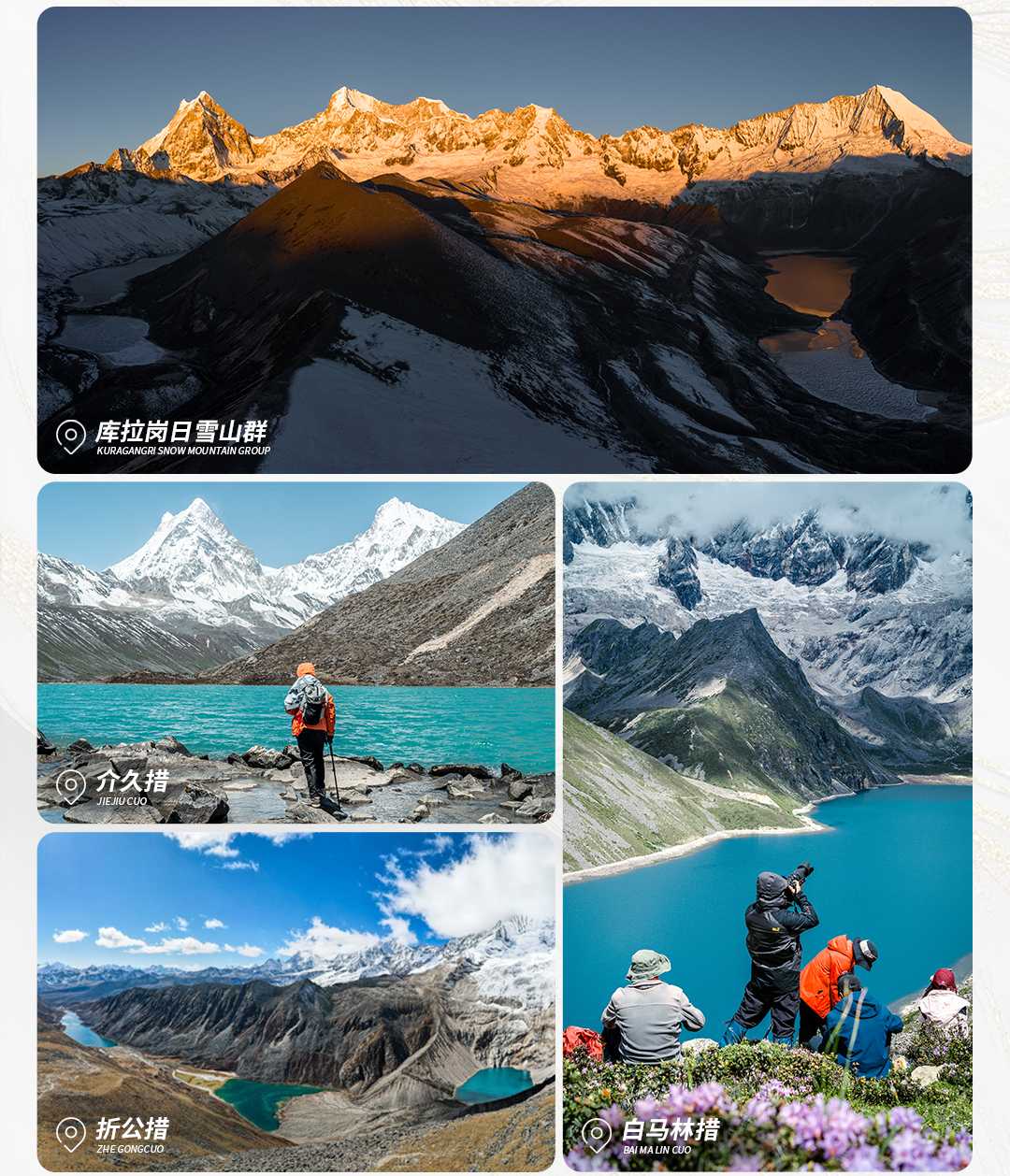 1、这是一次徒步探索之旅,近距离观赏雪山圣湖和寺庙,库拉岗日、过拉卡日和卡日疆等诸多雪山尽收眼底,羊湖、普莫雍错、白马林错、折公措(三神湖)、介久措以及赛卡古托寺等都在本次行程中。