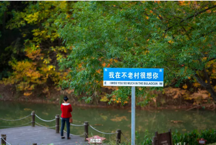 不老村毗邻象山湖公园、古刹七佛寺,周边景色风光秀丽,尤其是在这深秋季节,漫山遍野的红叶、黄叶交织在一起,绿中带黄、黄中透红,俨然一副浓墨重彩的油墨画,热情奔放又气势磅礴,风景美不胜收。
