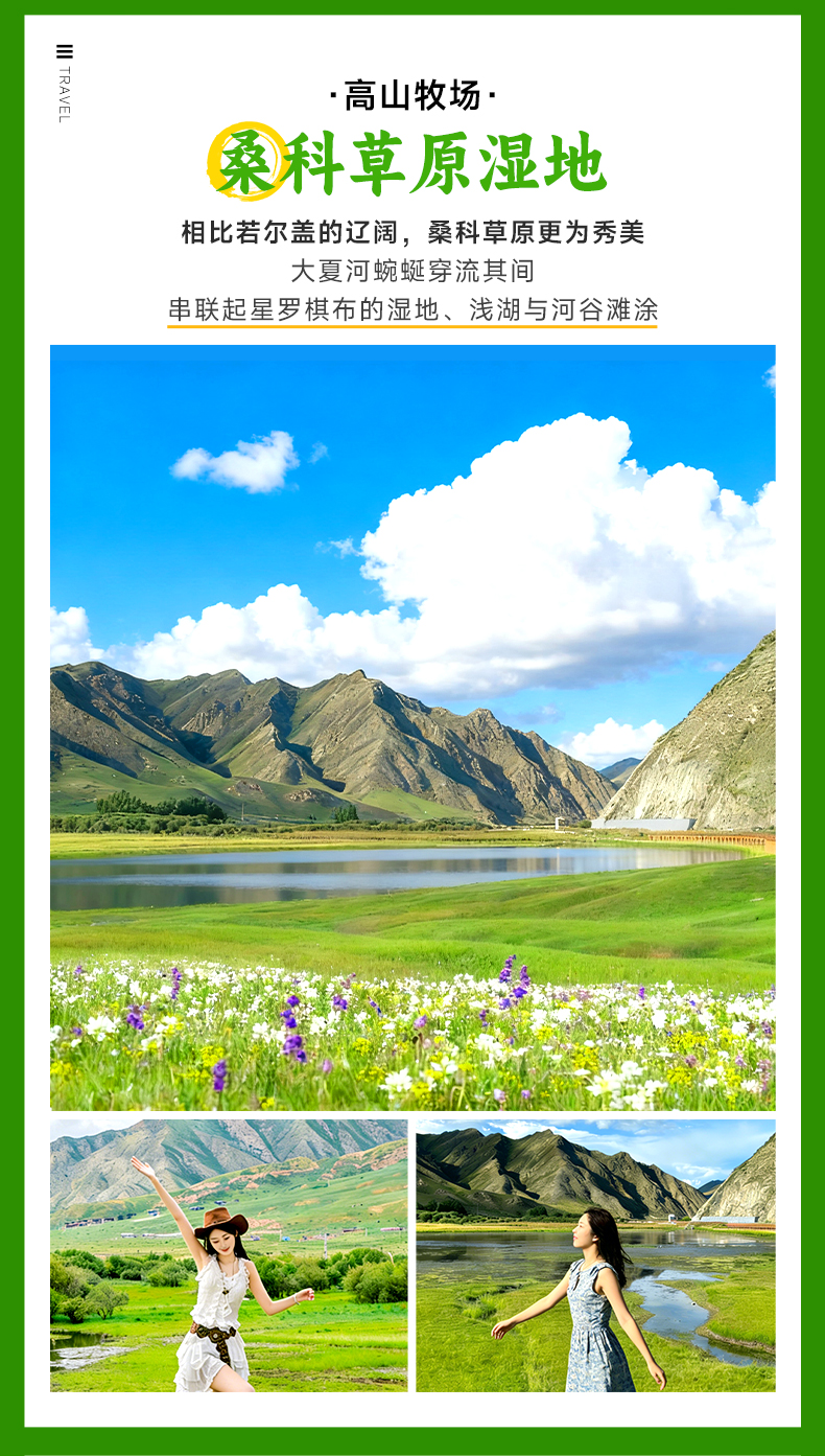 早餐过后,我们驱车前往水草丰美的【桑科草原湿地】(车程约90公里,用时1.5小时,游玩约1小时),每当夏季,绿草如地毯般在草原上铺开,其间点缀各色花卉,牛羊悠然,夏河蜿蜒,我们可以自行骑马、漫步,感受草原纯粹的宁静与自由。