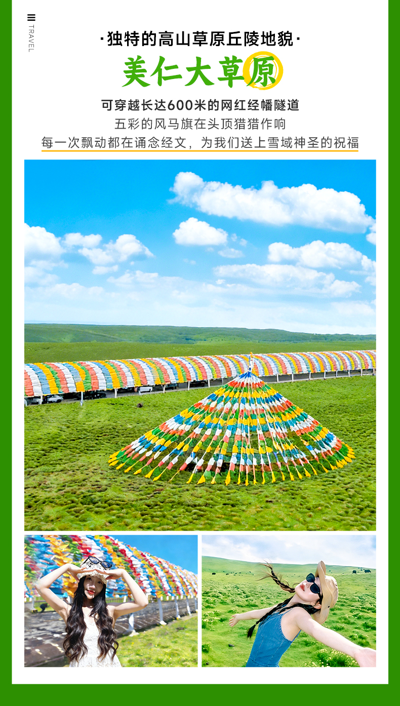 接着前往【美仁大草原】(车程约40km,用时约1小时,游玩约2小时),一路风景如画,牛羊成群悠闲自得,座座帐篷如明珠般镶嵌在碧绿的草地上,呈现在你眼前的每一幅景观几乎都似是Windows的桌面一般,令人心情无比舒畅。这里的草原和别处不一样,它的表面是一个个隆起的小草包,这正是它独有的冻胀丘地貌。这里也拥有长达长达600米的网红经幡隧道,拍照非常出片。