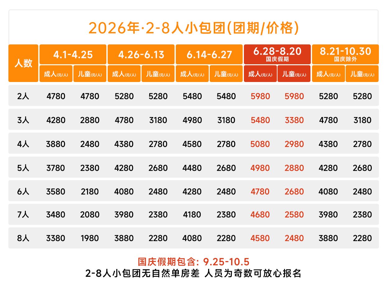 以上团期:成人4080元/人,儿童2280元/人, 房差:1000元
