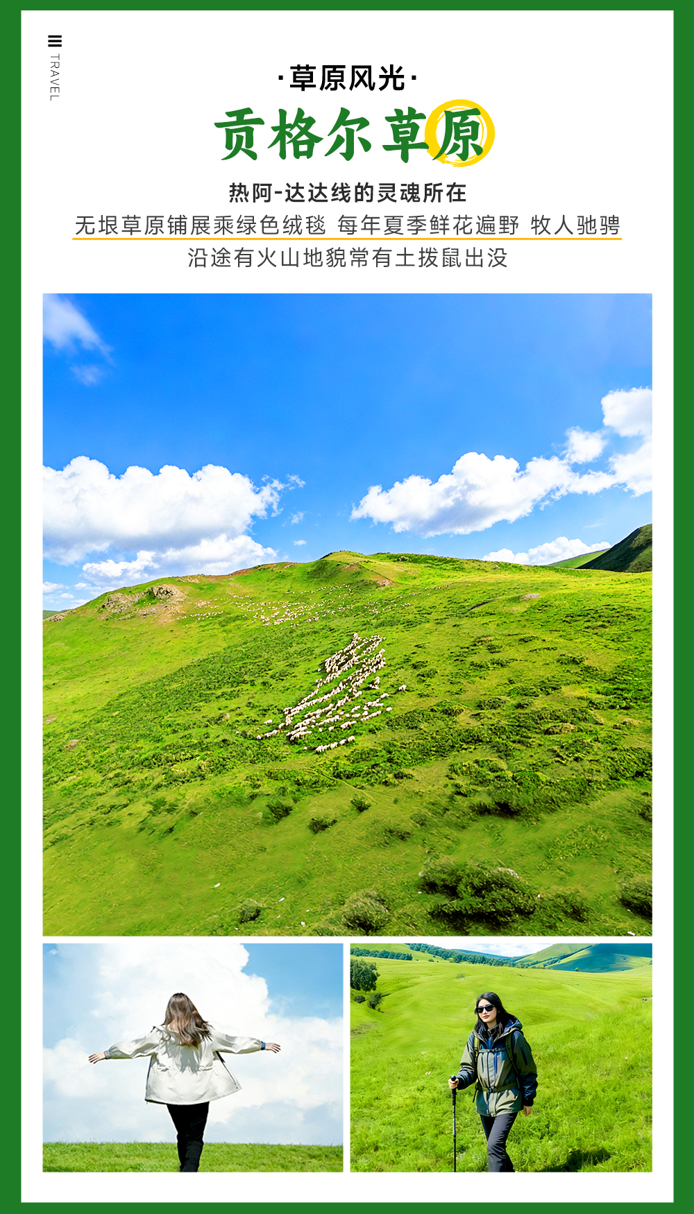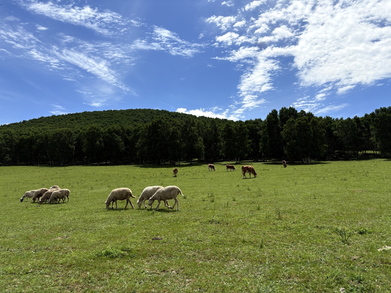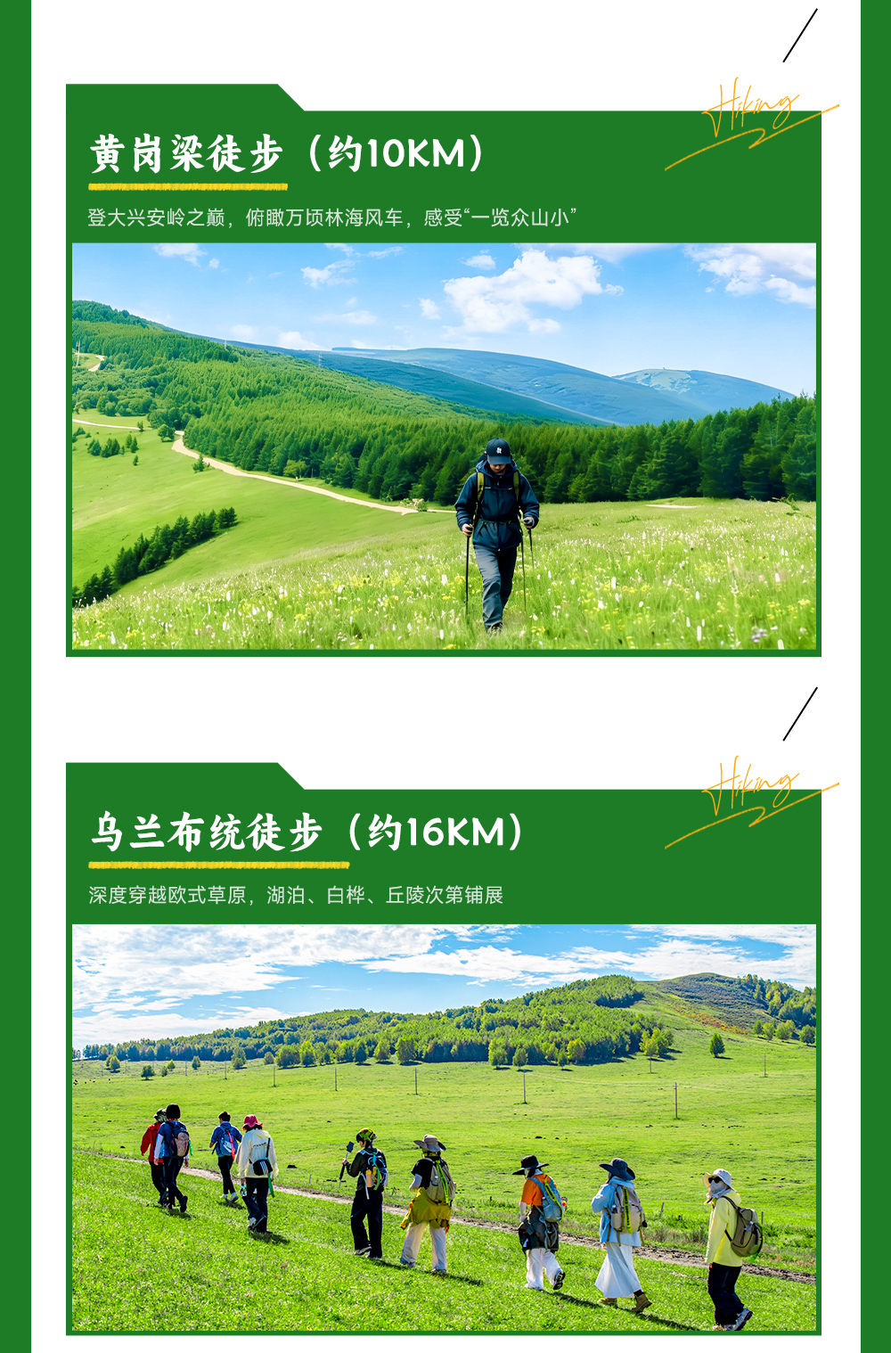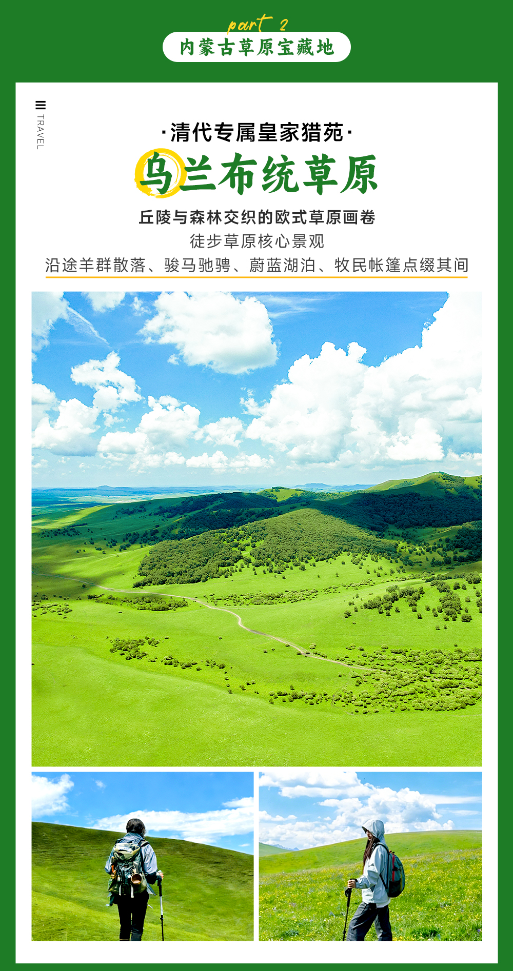 享用我们徒步简餐后,赏牛羊成群的琪琪格湖美景。夏日的乌兰布统【葫芦诺日】,这里是坝上草原特有的秘境,起伏的绿坡翻涌着层层草浪,金莲花与狼毒花铺成斑斓花毯,牛羊群在绿野间悠然踱步。天地间尽是草原的辽阔与温柔,20℃的清凉晚风裹着青草与花香,把夏日的美好揉进每一寸风光里。